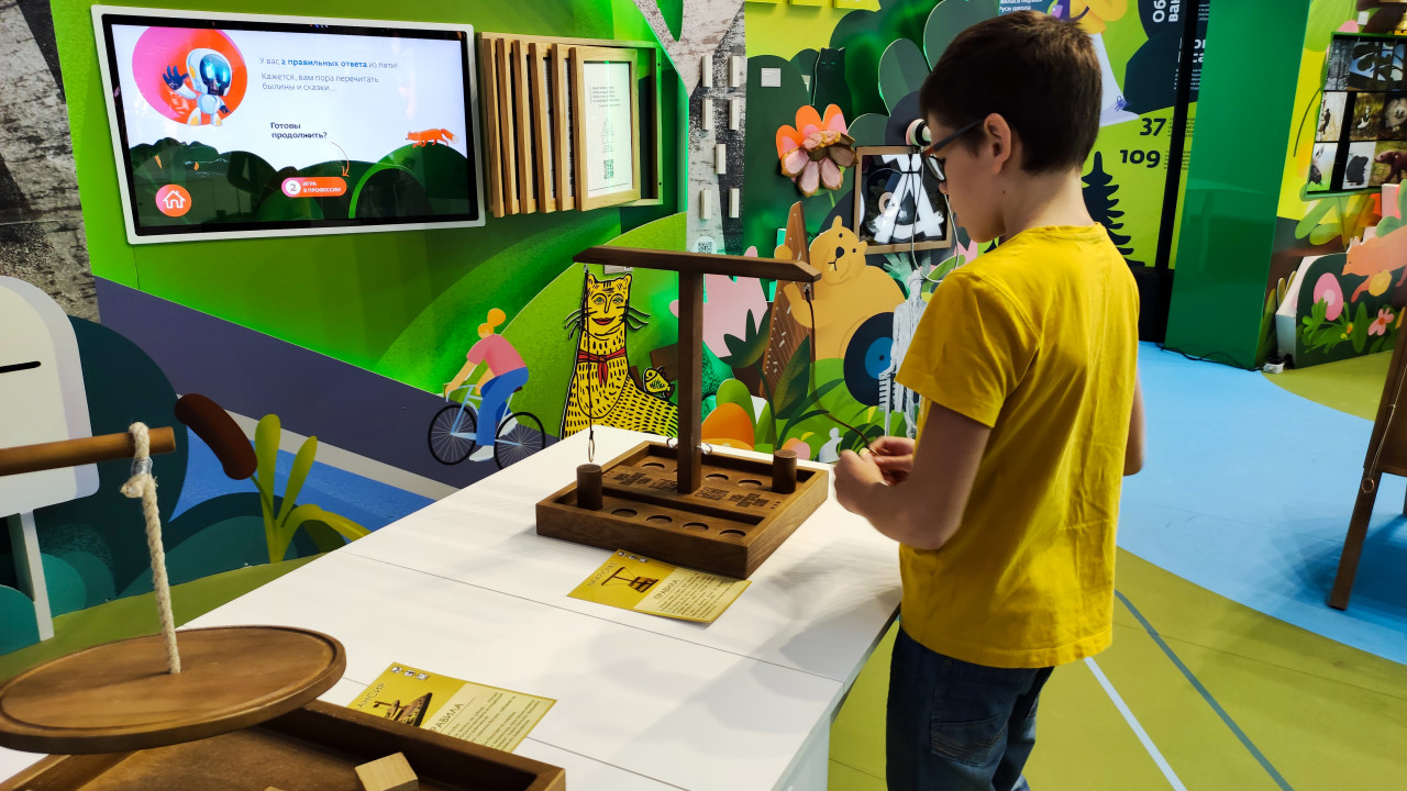 На фотографии запечатлён ребёнок, взаимодействующий с деревянным интерактивным экспонатом на выставочном столе. Экспозиция включает вертикальную конструкцию с элементами для игры и обучающую карточку с правилами. Пространство оформлено яркими иллюстрациями с животными и природными мотивами, а также экраном с цифровым интерфейсом на стене. Сцена отражает формат семейной и детской образовательной выставки, где посетители могут участвовать в игровых заданиях. Изображение подходит для использования в материалах о детском образовании, интерактивных музеях, семейном досуге и выставочных мероприятиях.
