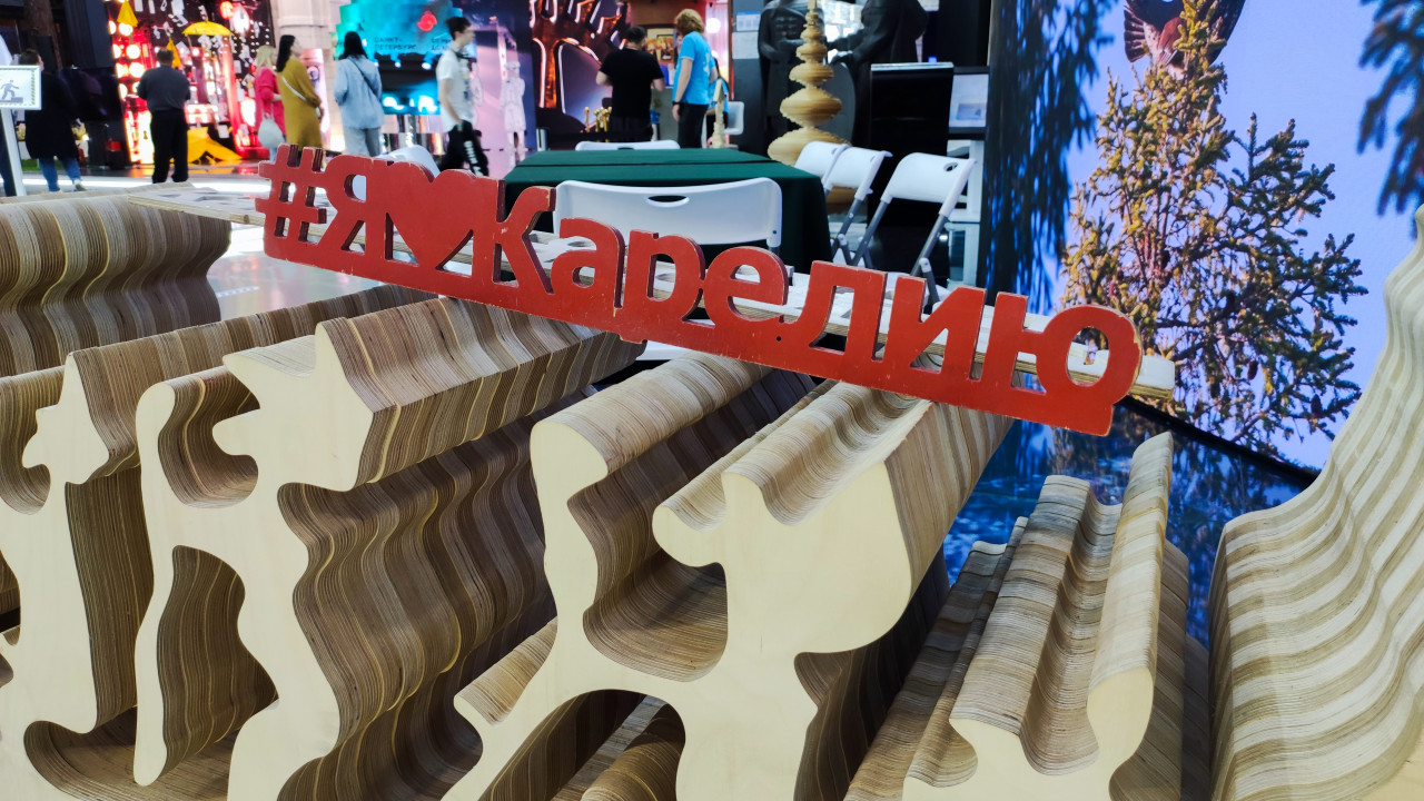 На фотографии запечатлён выставочный арт-объект с надписью «Я♥Карелию», выполненный из многослойной фанеры с фигурным контурным профилем. Объект установлен на столе в пространстве выставки или форума, вокруг видны элементы экспозиционного оборудования, складные стулья, экраны и посетители мероприятия. Конструкция используется как фотозона и визуальный акцент регионального стенда, посвящённого Республике Карелия, известной природным наследием, лесными ресурсами и деревообрабатывающей промышленностью. Снимок подходит для иллюстрации выставок, туристических презентаций, регионального брендинга и событийных мероприятий.