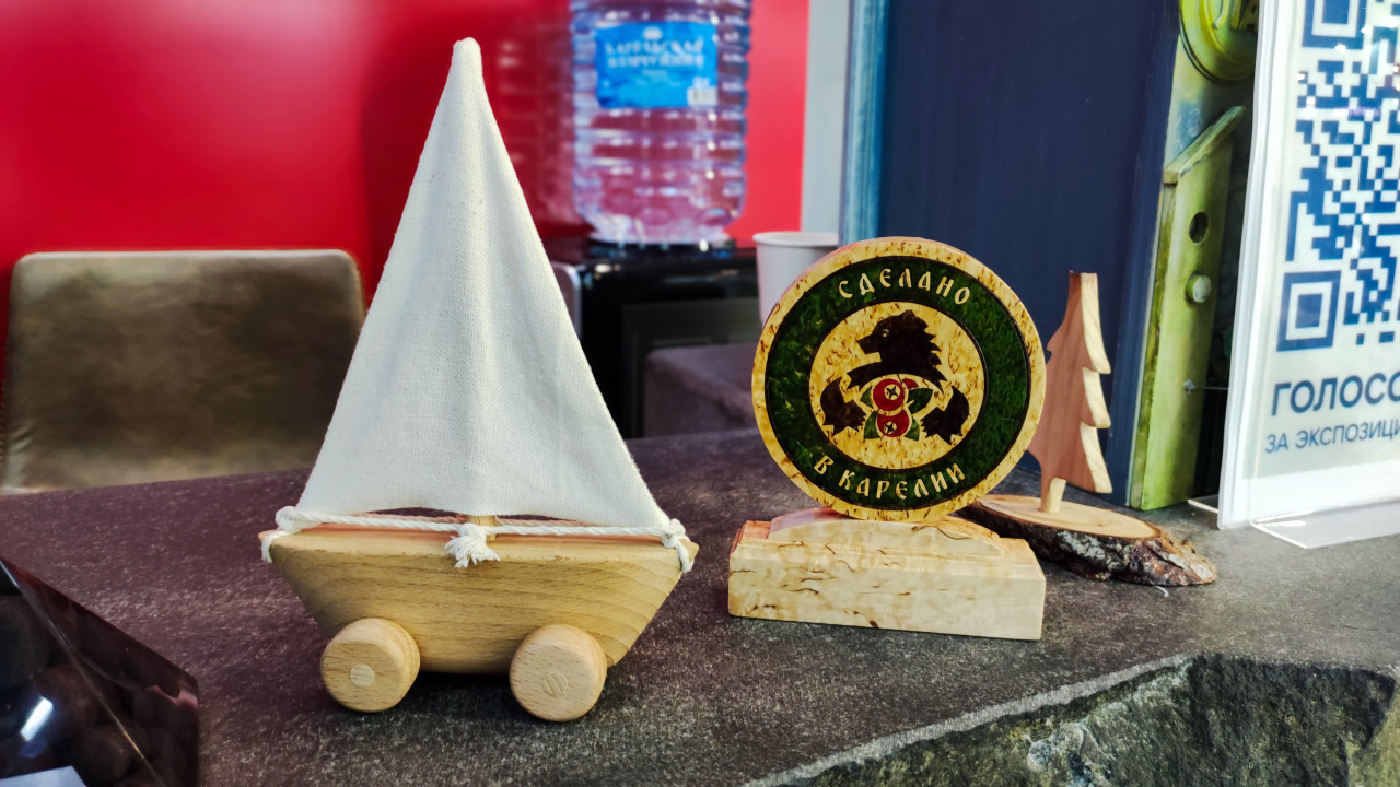 На фото представлен набор сувенирных изделий из дерева, размещённых на выставочном стенде. В кадре видна деревянная игрушка в виде лодки с тканевым парусом, круглый знак с надписью «Сделано в Карелии» и символикой региона, а также декоративная ёлка на спиле дерева. Предметы расположены на каменной поверхности, на фоне видны элементы выставочной инфраструктуры и QR-код для голосования. Экспозиция демонстрирует изделия местных производителей и подчёркивает традиции деревообработки Карелии. Фотография подходит для материалов о сувенирной продукции, ремёслах и региональных выставках.