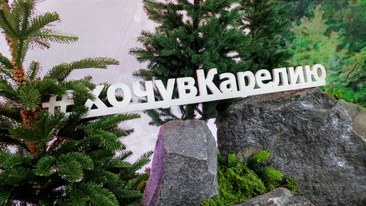 На фотографии запечатлён фрагмент выставочной композиции с надписью «#хочувКарелию», установленной на камнях среди искусственных елей и растительности. Каменные глыбы разного размера формируют рельеф, дополненный мхом и декоративными растениями. Фон создаётся экраном с природным изображением. Экспозиция визуально передаёт образ северного региона и используется как элемент туристического и имиджевого стенда. Фотография подходит для иллюстрации выставок, форумов, презентаций регионов и материалов о туристическом брендинге.