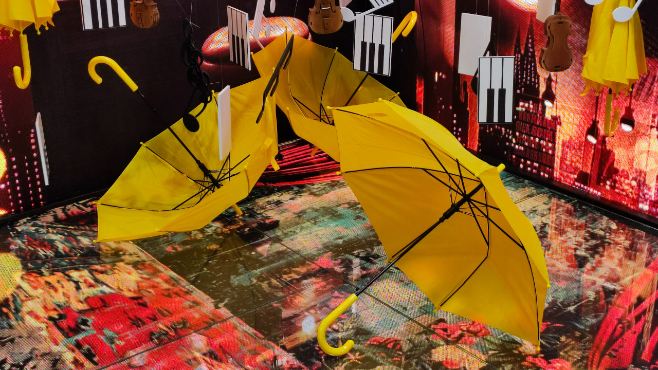 Фотография демонстрирует нижнюю часть выставочной инсталляции, где на полу экспозиции размещены раскрытые жёлтые зонты. Над ними подвешены декоративные элементы в виде нот и клавиш, создающие ассоциацию с музыкальным пространством. Инсталляция является частью тематического стенда в Павильоне №75 Международной выставки-форума «Россия» на ВДНХ в Москве. Подобное художественное решение используется для вовлечения посетителей и визуального акцента в экспозиции. Снимок может применяться в публикациях о современном выставочном оформлении и интерактивных арт-объектах.