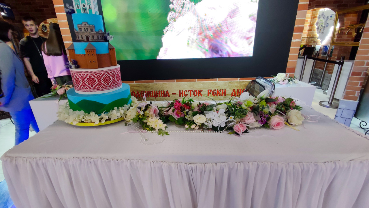 Экспозиционный стол с цветочным оформлением стенда Смоленщины
