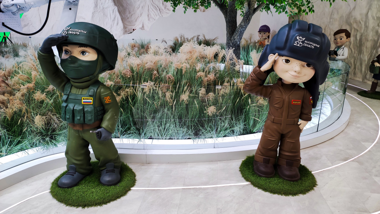 На фотографии изображены декоративные фигуры персонажей в защитной и рабочей экипировке, установленные на стенде Белгородской области в павильоне №75 Международной выставки-форума «Россия» на ВДНХ. Фигуры размещены на фоне ландшафтной инсталляции с искусственными травами и деревьями и использовались как часть визуального образа экспозиции региона. Объекты не являются памятниками и служили элементами выставочного дизайна. Снимок может применяться в материалах о выставках, региональных презентациях и оформлении общественных пространств.