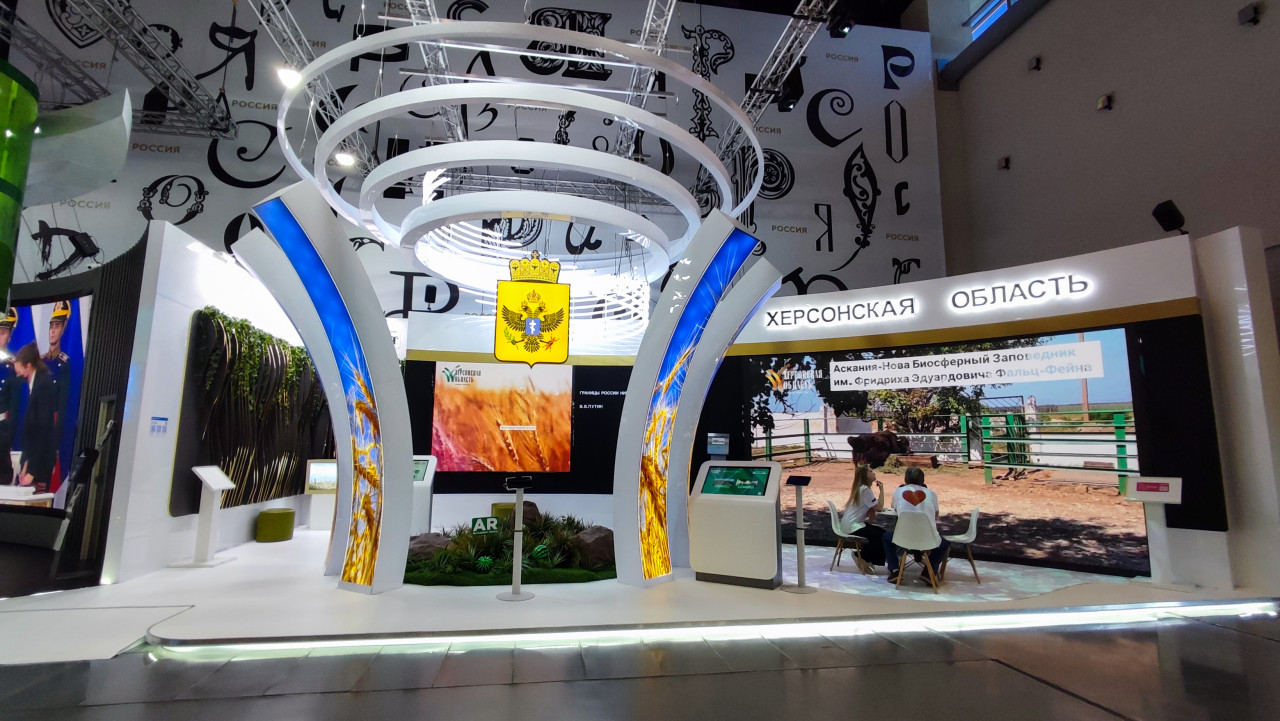 вднх москва выставка россия павильон выставочный комплекс музей экспозиция общественное пространство культурное событие презентация выставка ВДНХ павильон 75 Россия международная выставка региональный стенд Херсонская область экспозиция региона интерактивные экраны мультимедийный стенд выставочный дизайн презентация региона архитектура стенда туристический потенциал природные объекты Аскания Нова выставочное пространство интерьер павильона информационный стенд культурная презентация регионы России общественное мероприятие визуальная коммуникация современная экспозиция демонстрация регионовПохожие фотографии