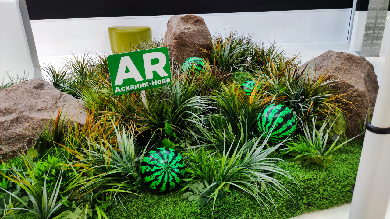 На снимке представлена декоративная инсталляция с растениями, камнями и муляжами арбузов, сопровождаемая указателем AR-зоны «Аскания-Нова». Композиция являлась частью стенда Херсонской области в Павильоне №75 Международной выставки-форума «Россия» на ВДНХ и использовалась для дополненной реальности, позволяя посетителям взаимодействовать с цифровым контентом. Элемент оформления отсылает к природным ландшафтам и сельскохозяйственной тематике региона. Фотография может применяться в материалах о выставках, интерактивных технологиях и региональных презентациях.