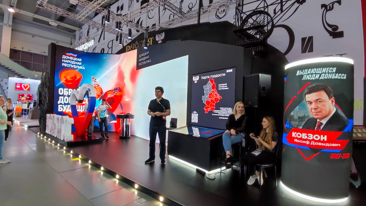 вднх москва выставка россия павильон выставочный комплекс музей экспозиция общественное пространство культурное событие презентация выставка ВДНХ павильон 75 выставка Россия Донецкая Народная Республика Донбасс региональный стенд мультимедийная экспозиция интерактивная карта выдающиеся люди Иосиф Кобзон историческая память культурное наследие выставочный дизайн информационные экраны форум регионы России тематическая экспозиция современная история Москва выставочный зал цифровые технологииПохожие фотографии