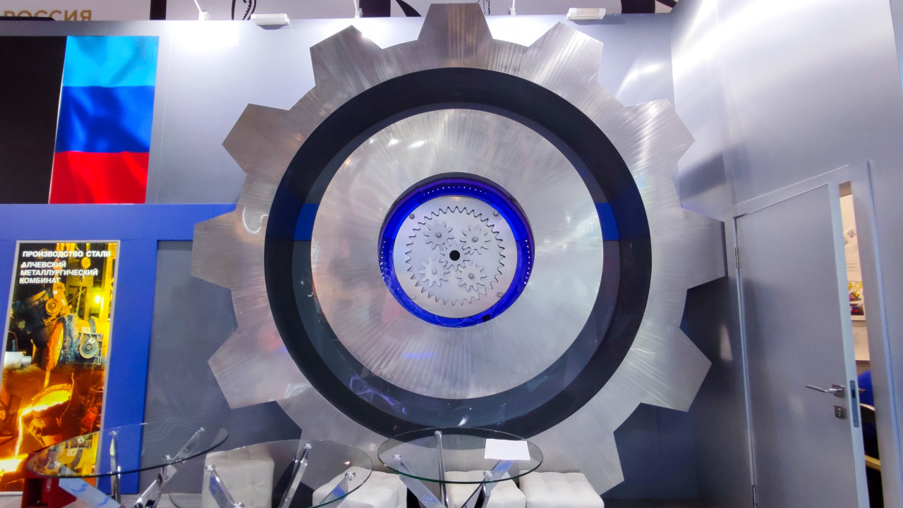 Снимок выполнен в павильоне №75 на ВДНХ в период проведения Международной выставки-форума «Россия». На фотографии изображён крупный декоративный объект в виде металлической шестерни с подсвеченным центральным механизмом, символизирующий промышленный потенциал региона. Инсталляция размещена внутри стенда и используется как визуальный акцент, подчёркивающий развитие металлургии и машиностроения. В оформлении сочетаются металл, стекло и световые элементы. Фото подходит для иллюстрации тем промышленного развития, выставочных инсталляций, региональной экономики и инженерных символов.
