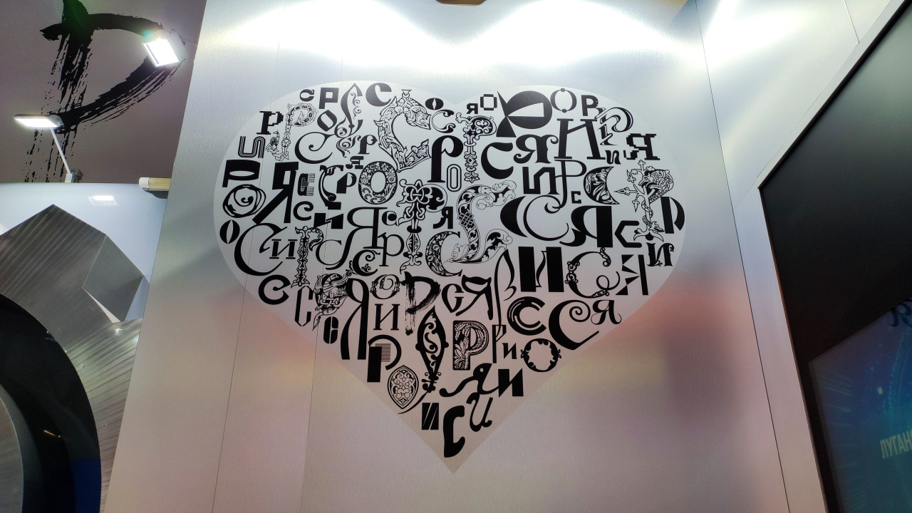 Фотография сделана в павильоне №75 на ВДНХ во время Международной выставки-форума «Россия», проходившей с 4 ноября 2023 года по 8 июля 2024 года. В кадре представлена настенная художественная инсталляция в форме сердца, составленная из стилизованных букв кириллицы с декоративными орнаментами. Композиция выполнена в чёрно-белой графике и используется как визуальный символ культурной идентичности региона. Инсталляция размещена на стенде одного из субъектов Российской Федерации и служила элементом оформления экспозиции. Фотография может использоваться в материалах о выставочном дизайне, региональных экспозициях, современной типографике и культурных форумах.