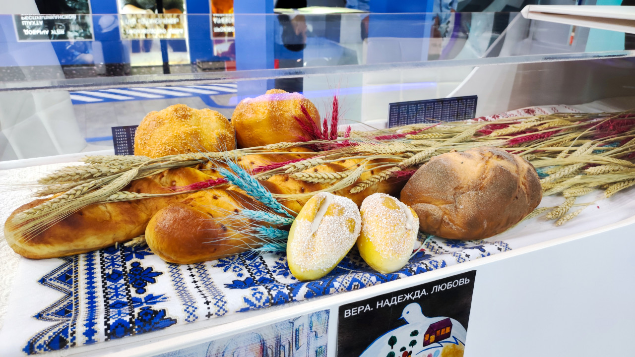 Снимок выполнен в павильоне №75 на ВДНХ в рамках Международной выставки-форума «Россия». На фотографии показана витрина с хлебобулочными изделиями, колосьями пшеницы и декоративным текстилем с традиционной вышивкой. Экспозиция символизирует сельское хозяйство и продовольственную культуру региона, подчёркивая значение земледелия и хлеба в традиционном укладе. Композиция размещена на стенде одного из субъектов страны и использовалась для демонстрации аграрного потенциала. Фото подходит для иллюстраций тем сельского хозяйства, продовольственной безопасности и региональных выставок.