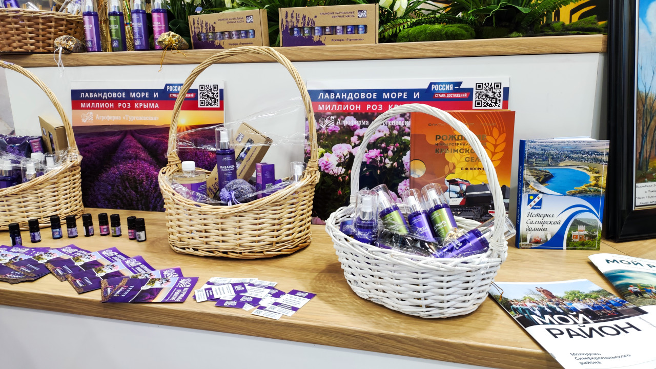 Фотография сделана в павильоне №75 ВДНХ в рамках Международной выставки-форума «Россия». В кадре показана витрина стенда Республики Крым с сувенирной продукцией на лавандовую тематику: плетёные корзины с косметическими средствами, флаконы, открытки, буклеты и информационные материалы. На заднем плане размещены изображения лавандовых полей и печатные издания о регионе. Экспозиция отражает аграрные и туристические особенности Крыма. Фото может использоваться в материалах о региональных брендах, туризме, сувенирной продукции и выставках.