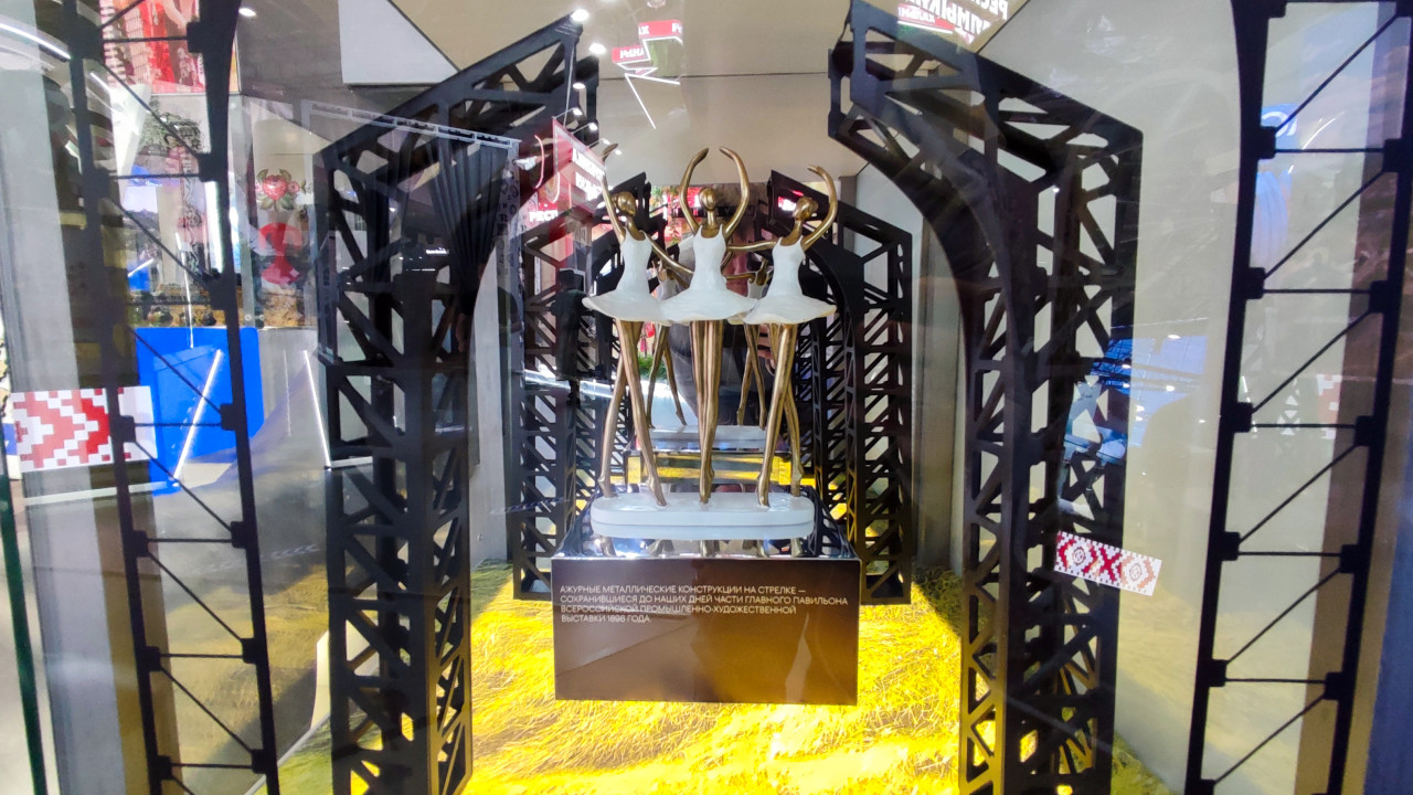 Снимок выполнен в павильоне №75 ВДНХ на Международной выставке-форуме «Россия». На фотографии показана художественная инсталляция с тремя стилизованными фигурами танцовщиц в светлых костюмах, размещёнными внутри чёрной металлической конструкции, напоминающей архитектурные пролёты. Композиция подсвечена и установлена на подиуме с пояснительной табличкой. Инсталляция отсылает к промышленной и художественной выставочной традиции конца XIX века. Фотография может использоваться в материалах о выставочном искусстве, архитектурных мотивах и современных интерпретациях исторических форм.
