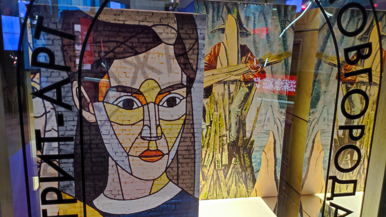 На фотографии показана часть художественной инсталляции в Павильоне №75 Международной выставки-форума «Россия» на ВДНХ в Москве. В кадре видны вертикальные панели с графическим портретом в стилистике витража и иллюстрацией фигуры с инструментами, выполненные в насыщенной цветовой гамме. Экспозиция размещалась в одном из залов павильона и служила визуальным элементом региональных стендов, отражая темы труда, культуры и истории. Снимок может использоваться в материалах о выставочном дизайне, культурных мероприятиях, современных экспозициях и визуальном искусстве.