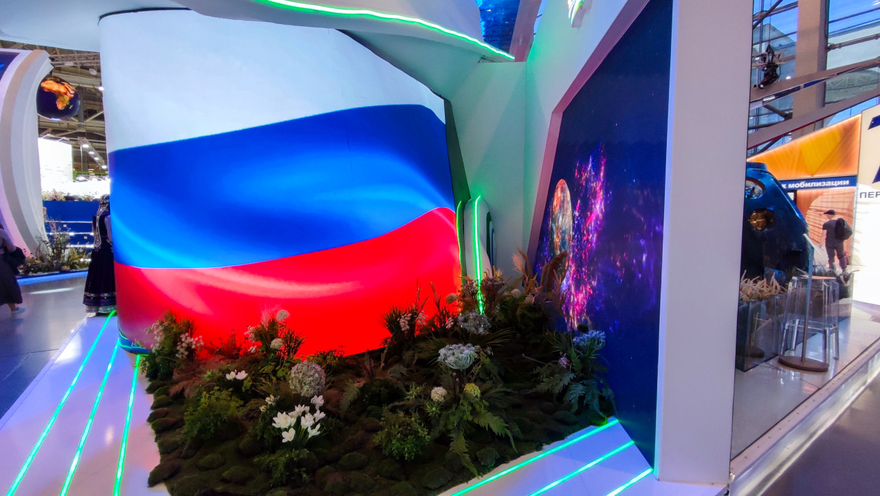 вднх москва выставка россия павильон выставочный комплекс музей экспозиция общественное пространство культурное событие презентация выставка инсталляция флаг России государственная символика оформление дизайн световая инсталляция декоративные элементы растения павильон 75 ВДНХ форум Россия Москва 2023 2024 выставочный стенд интерьер павильона тематическое оформление символика современная экспозиция визуальный акцент медиа оформление выставочный залПохожие фотографии