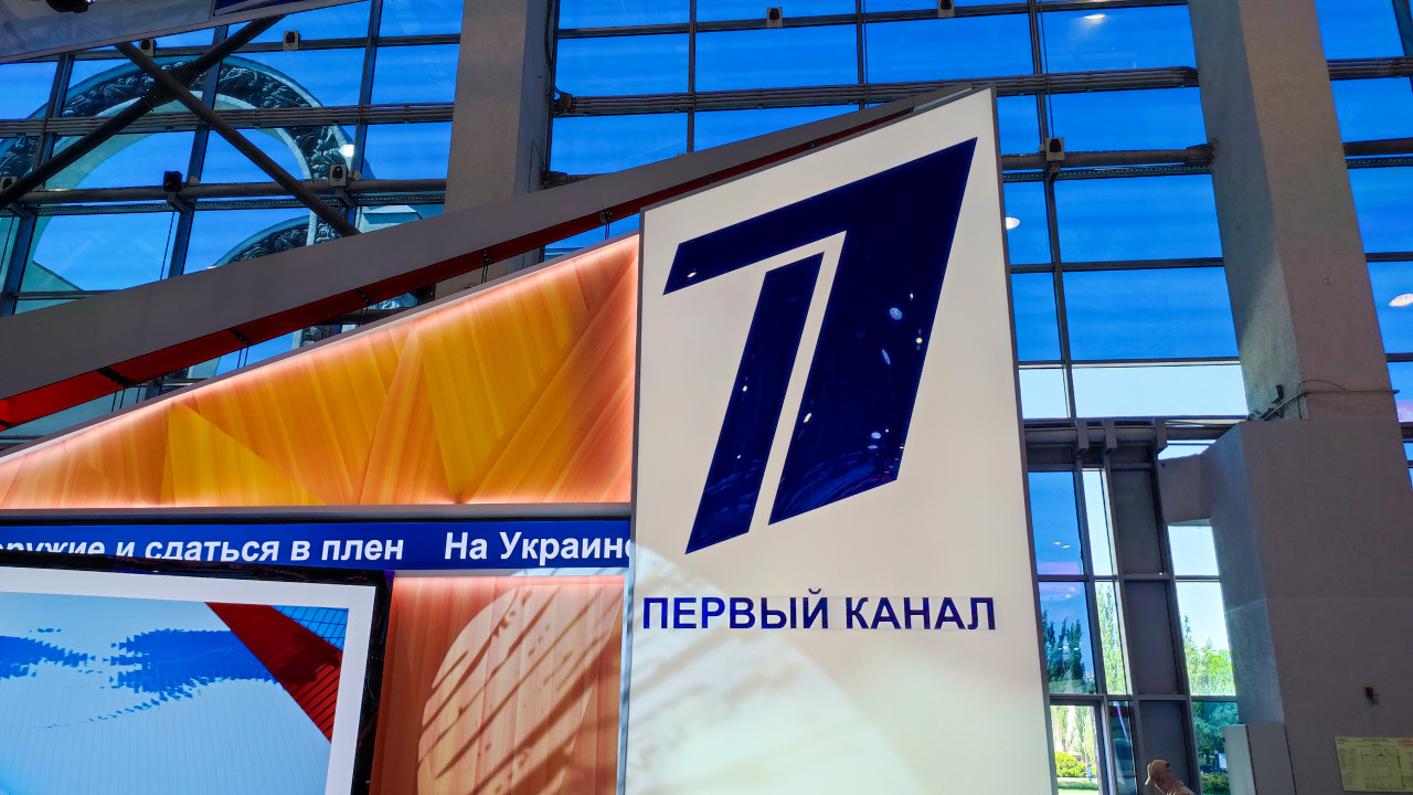 На фотографии зафиксирован экспозиционный стенд «Первый канал», расположенный в Павильоне №75 Международной выставки-форума «Россия» на ВДНХ. В кадре виден высокий вертикальный элемент с логотипом телеканала, элементы архитектуры павильона, панорамное остекление и выставочное освещение. Стенд служил визуальной точкой медийной зоны, посвящённой телевидению и федеральным СМИ. Фотография подходит для иллюстраций на темы телевидения, медиаиндустрии, выставок и общественных форумов федерального масштаба.