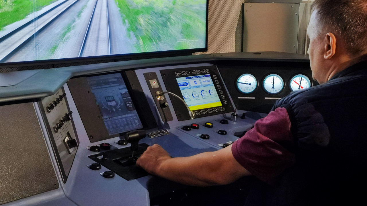 На фотографии показан фрагмент рабочего места участника тренажёра машиниста, установленного в павильоне Е выставки-форума «Россия» на ВДНХ. Видны цифровые панели, аналоговые приборы, рычаг управления, индикаторы и большой монитор, на котором отображается виртуальная железнодорожная магистраль. Мужчина управляет симулятором, демонстрируя процесс обучения работе с локомотивом. Снимок подходит для материалов об обучающих технологиях, транспортной отрасли и интерактивных экспозициях.