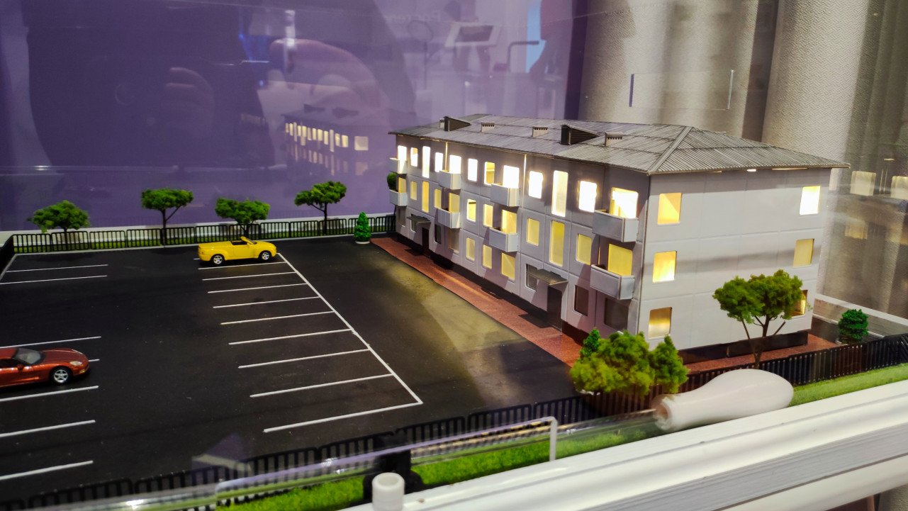 На фотографии изображён макет жилого дома с освещёнными окнами, представленный в одной из зон экспозиции павильона «Е» выставки-форума «Россия» на ВДНХ. Перед зданием расположена парковка с размеченными местами, на которой стоят миниатюрные модели автомобилей. Зона макета отделена прозрачной витриной. На заднем плане отражаются элементы стенда. Макет демонстрирует принципы моделирования городской среды и может использоваться для материалов о градостроительстве, архитектурных проектах и выставочных технологиях.