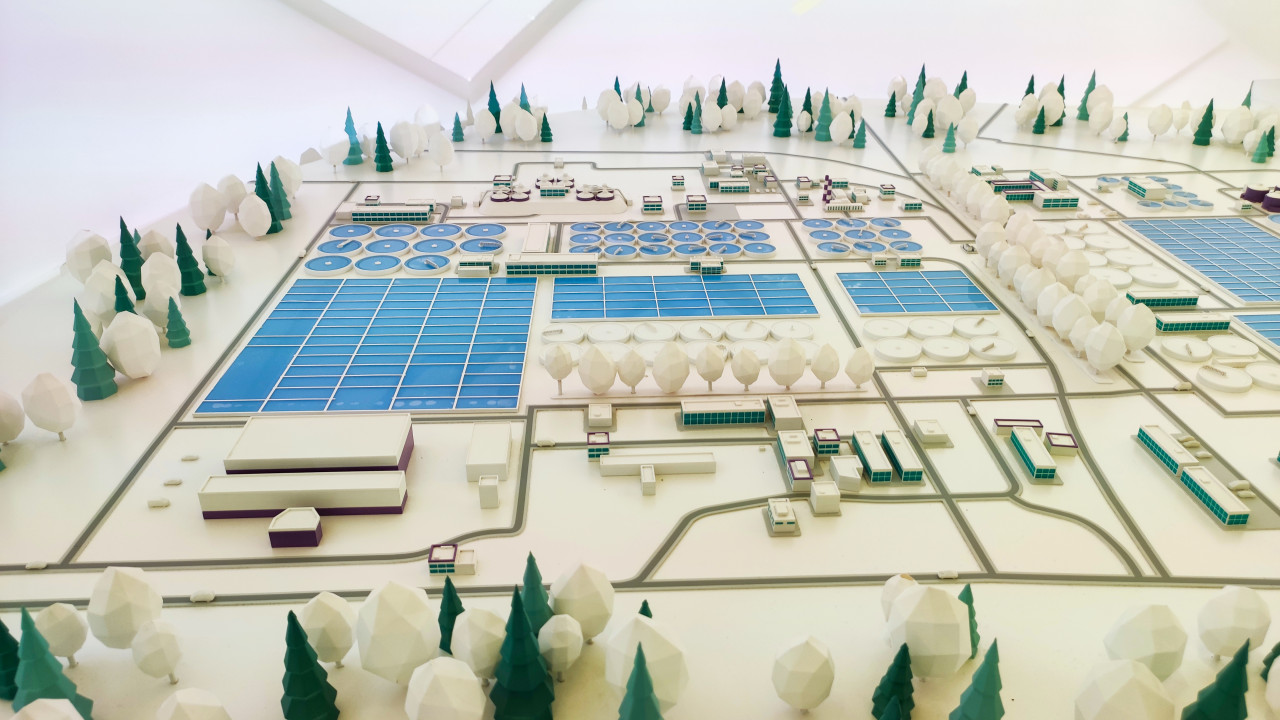 На фотографии представлен масштабный макет комплекса инженерных сооружений, выполненный в виде планировочной модели с резервуарами, зданиями, дорогами и зелёными насаждениями. В кадре различимы круглые и прямоугольные элементы, имитирующие технологические зоны, а также условные деревья и инфраструктурные связи. Макет является частью экспозиции Музея городского хозяйства Москвы и используется для наглядного показа принципов работы систем водоочистки. Снимок сделан в 2024 году в павильоне №5 ВДНХ в рамках выставки-форума «Россия». Фотография подходит для использования в материалах об инженерной экологии, коммунальной инфраструктуре и музейных образовательных проектах.
