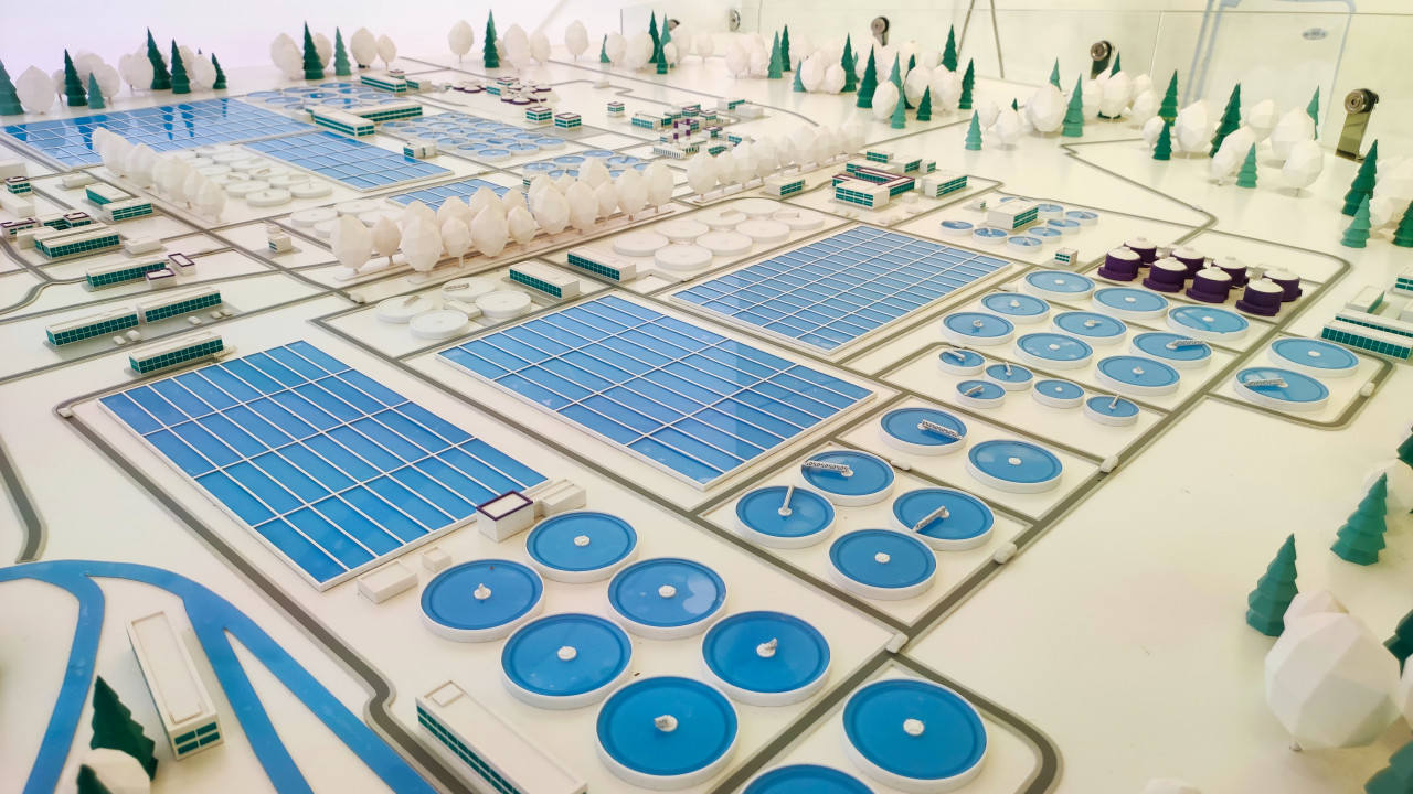Фотография сделана в Музее городского хозяйства Москвы в павильоне №5 ВДНХ в период форума «Россия» 2024 года. В кадре представлен интерактивный макет Люберецких очистных сооружений, раскрывающий последовательность технологических этапов очистки сточных вод. Видны зоны механической очистки, песколовки, отстойники и аэротенки, а также участки финальной фильтрации и обеззараживания воды. Экспозиция позволяет посетителям понять, как загрязнённая вода проходит сложный многоступенчатый путь и становится безопасной для возврата в природную среду. Макет размещён в разделе, посвящённом водоснабжению и водоотведению города. Снимок может использоваться в материалах о городской экологии, коммунальном хозяйстве и образовательных музейных проектах.