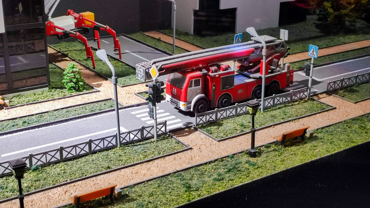 На фотографии представлен фрагмент масштабного макета жилого квартала с пожарной техникой, задействованной в условной ликвидации пожара. В кадре видна пожарная автолестница, установленная на проезжей части, элементы тротуаров, газоны, уличные фонари и пешеходные зоны. Макет иллюстрирует размещение и маневрирование пожарной техники в условиях плотной городской застройки. Снимок сделан в 2024 году в экспозиции Музея городского хозяйства Москвы, расположенного в павильоне №5 ВДНХ, во время выставки-форума «Россия». Экспонат используется в образовательных целях для демонстрации работы экстренных служб. Фотография подходит для публикаций о городской безопасности и инфраструктуре.