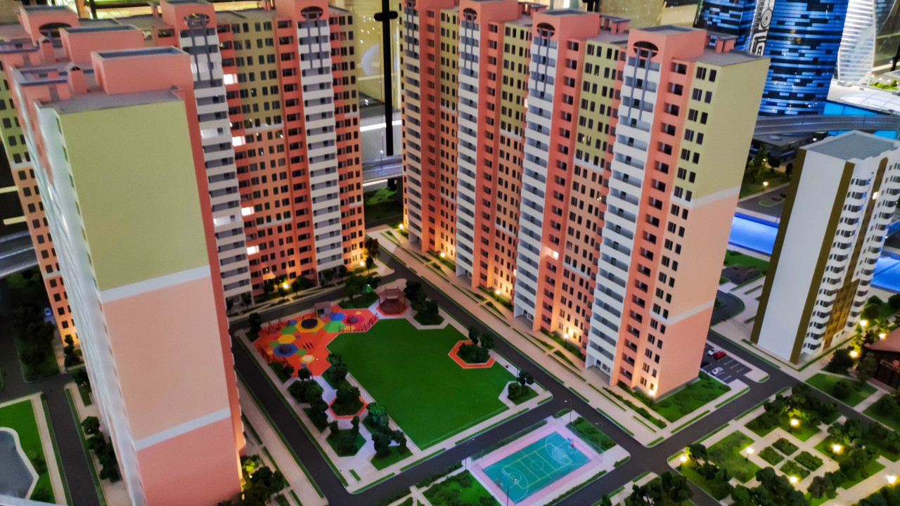 Макет жилых домов с дворовым пространством и спортивной площадкой