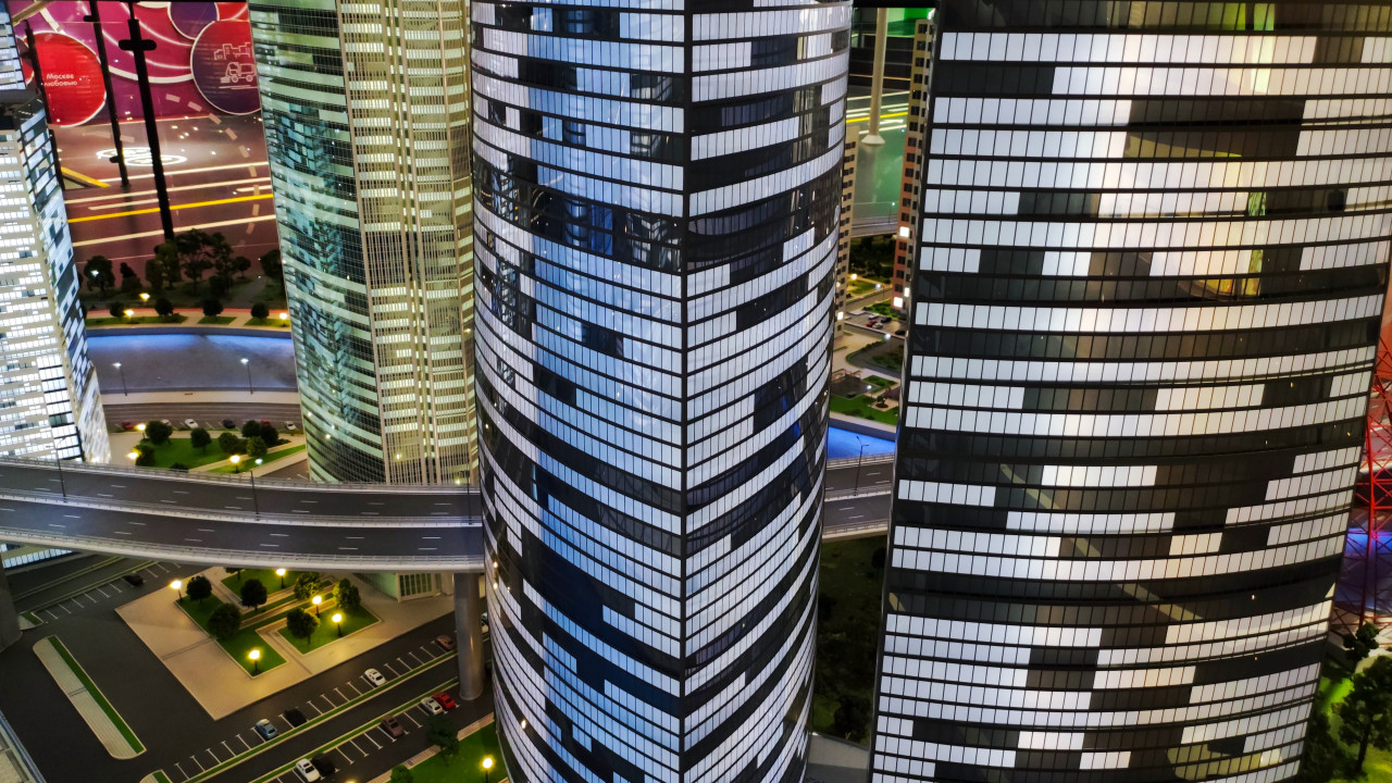Фотография показывает крупный план высотных зданий со стеклянными фасадами, выполненных в виде архитектурного макета в Музее городского хозяйства Москвы в павильоне №5 ВДНХ. Снимок сделан в 2024 году во время выставки-форума «Россия». В кадре заметны башни различной формы, ритм окон, отражающие поверхности и подсветка, имитирующая ночной городской пейзаж. Экспонат иллюстрирует современные архитектурные решения для деловой и многофункциональной застройки. Фотография может использоваться в публикациях об архитектуре, градостроительстве и развитии мегаполисов.