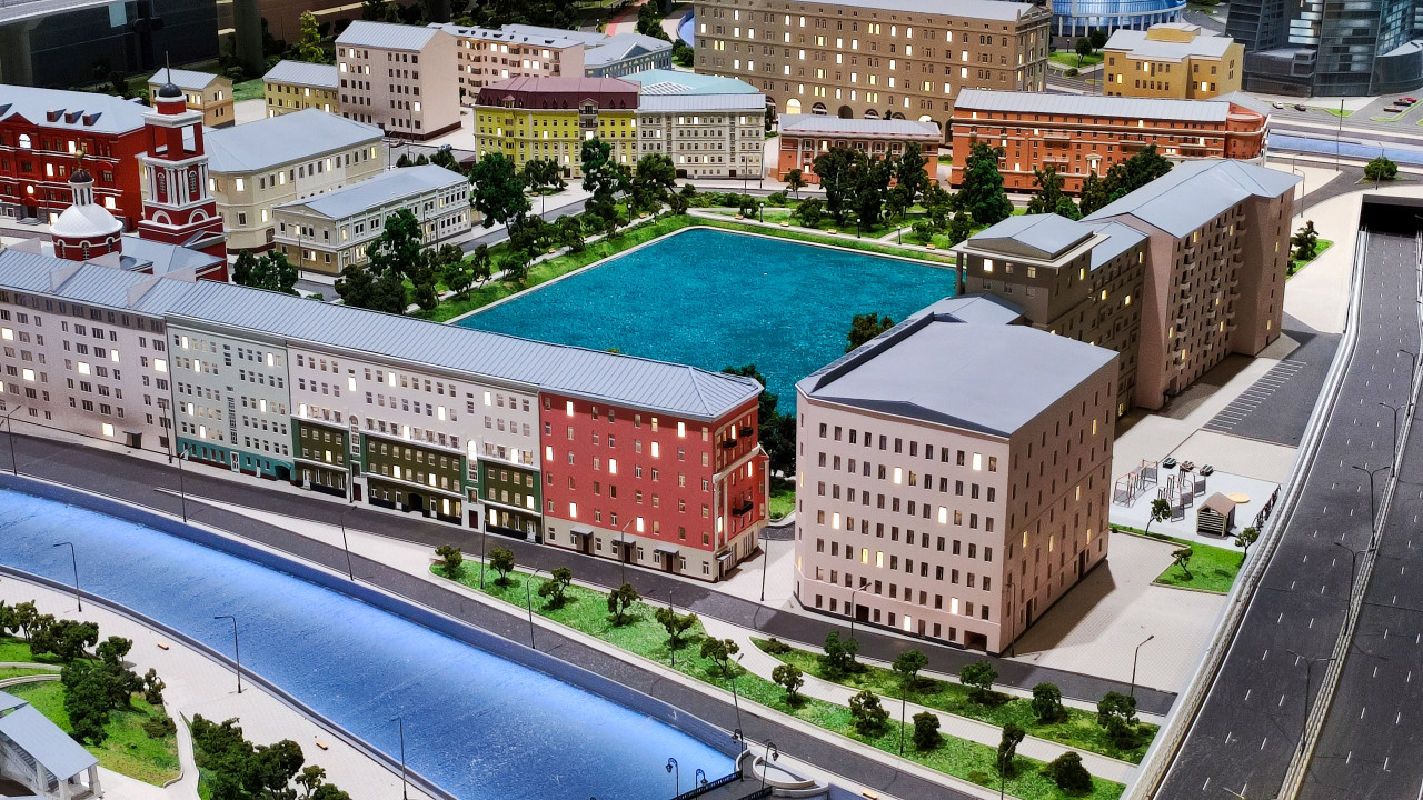 На фотографии запечатлён участок интерактивного макета Москвы из раздела «Город» Музея городского хозяйства Москвы в павильоне №5 ВДНХ. В композиции показан городской квартал с искусственным водоёмом, окружённым зелёными насаждениями, пешеходными дорожками и плотной застройкой. Здания различной этажности демонстрируют типовую и историческую жилую архитектуру, характерную для московских районов. Макет подчёркивает роль общественных пространств, водных объектов и озеленения в формировании комфортной городской среды. Экспозиция используется для наглядного объяснения принципов планировки города и может быть востребована в материалах о музеях, урбанистике и инфраструктуре мегаполиса.
