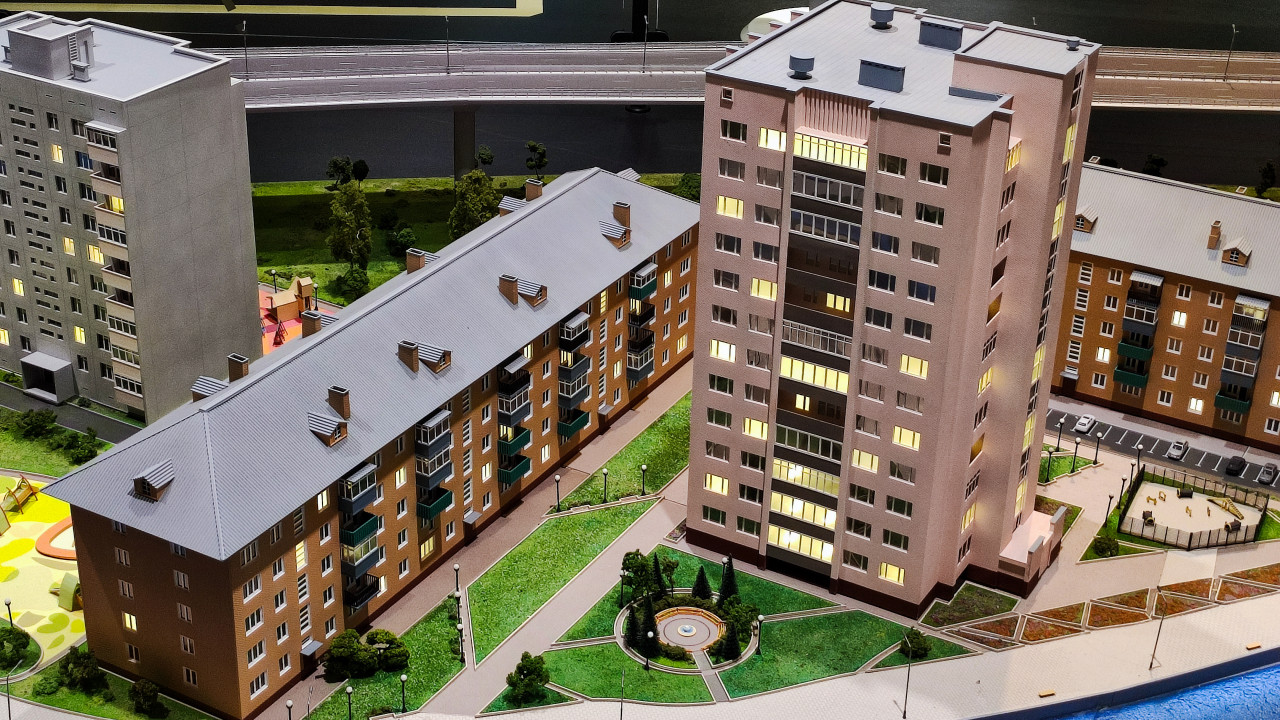 На фотографии представлен фрагмент 13-метрового интерактивного макета Москвы из раздела «Город» Музея городского хозяйства Москвы, размещённого в павильоне №5 ВДНХ. В кадре показан жилой квартал с многоэтажными домами различной этажности, выполненными в масштабе, с детализированными фасадами, балконами и подсвеченными окнами. Между зданиями организовано дворовое пространство с пешеходными дорожками, газонами, элементами озеленения и круглой площадкой благоустройства. Макет демонстрирует принципы планировки жилых районов, размещение домов и формирование внутриквартальной среды. Фотография подходит для материалов о городской инфраструктуре, урбанистике, жилищном строительстве и музейных экспозициях.