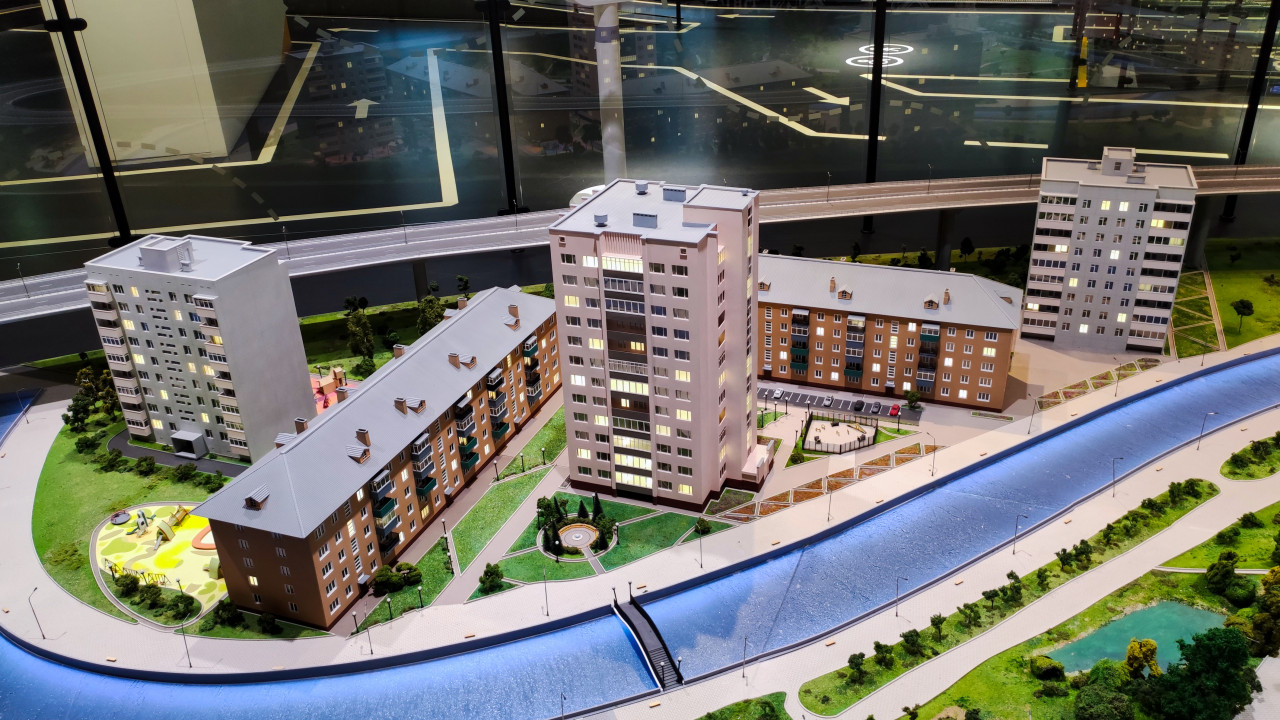 На фотографии представлен фрагмент 13-метрового макета Москвы из раздела «Город» Музея городского хозяйства Москвы в павильоне №5 ВДНХ. В кадре показана жилая застройка с многоэтажными домами, над которыми проходит транспортная эстакада. Детализация макета позволяет рассмотреть улично-дорожную сеть, уровневую организацию движения и размещение зданий в городской структуре. Подсветка окон создаёт эффект имитации жилой среды. Экспозиция иллюстрирует взаимодействие жилых кварталов и транспортной инфраструктуры, а также использование многоуровневых решений в планировке города. Фотография подходит для материалов о транспортной системе и градостроительном развитии Москвы.