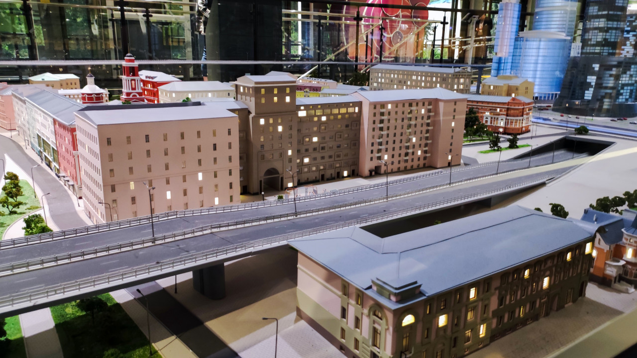 Фотография сделана в Музее городского хозяйства Москвы и показывает детализированный участок 13-метрового макета столицы. В кадре представлена городская улица с мостовым сооружением, многоэтажными зданиями и элементами уличной инфраструктуры. Застройка выполнена в характерных для Москвы архитектурных формах без акцента на конкретные объекты. Макет демонстрирует плотность городской среды, роль мостов в формировании транспортных и пешеходных связей, а также организацию улично-дорожной сети. Экспозиция используется для наглядного объяснения принципов градостроительства и может применяться в образовательных и информационных материалах.