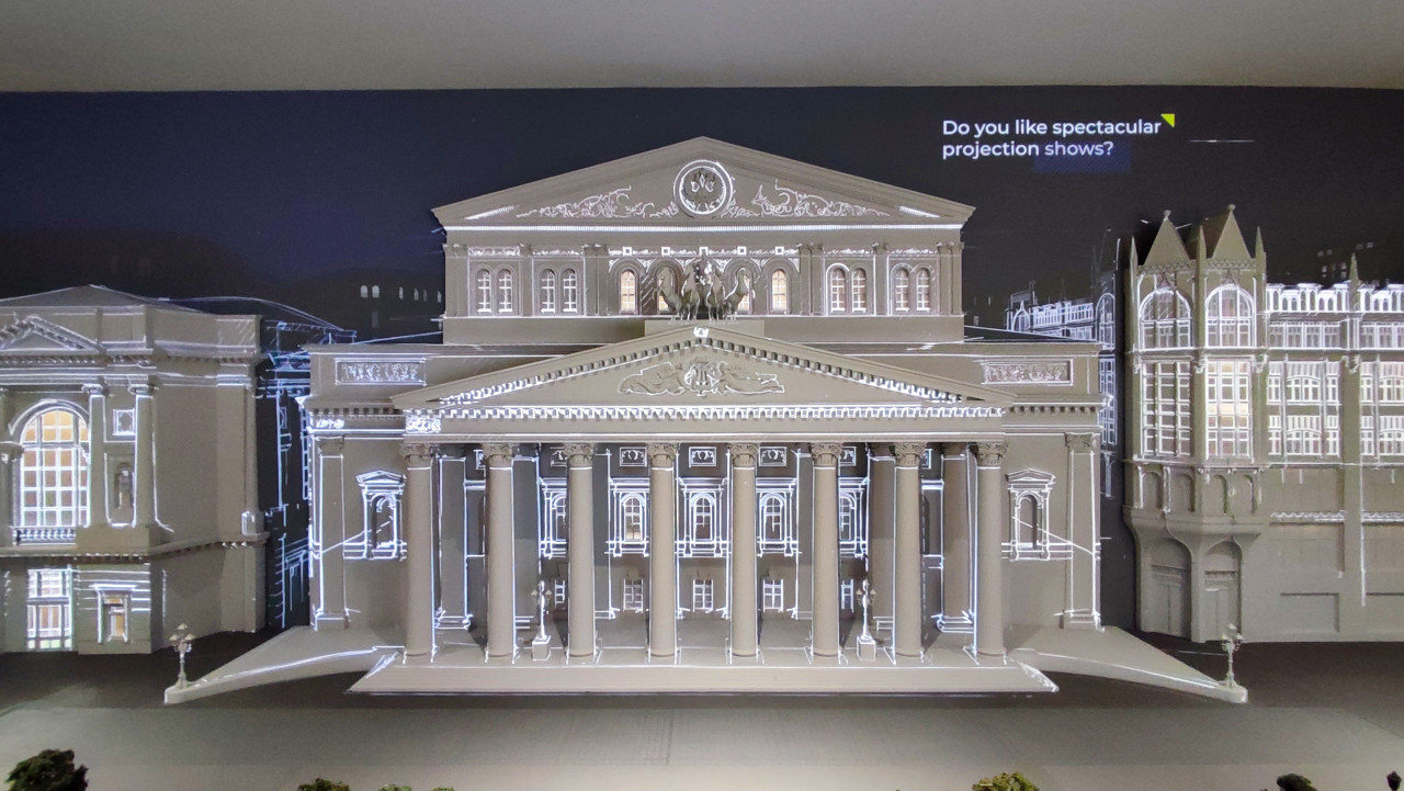 Фотография сделана в Музее городского хозяйства Москвы и демонстрирует макет Большого театра с использованием проекционной архитектурной подсветки. В кадре показан главный фасад здания, на который нанесены световые контуры, подчёркивающие колонны, фронтон и оконные проёмы. Такой приём используется для визуального выделения архитектурных форм и демонстрации возможностей световых решений для исторических зданий. Большой театр является памятником архитектуры XIX века и важнейшим культурным объектом Москвы. Снимок подходит для материалов о световых технологиях, архитектуре и музейных экспозициях.