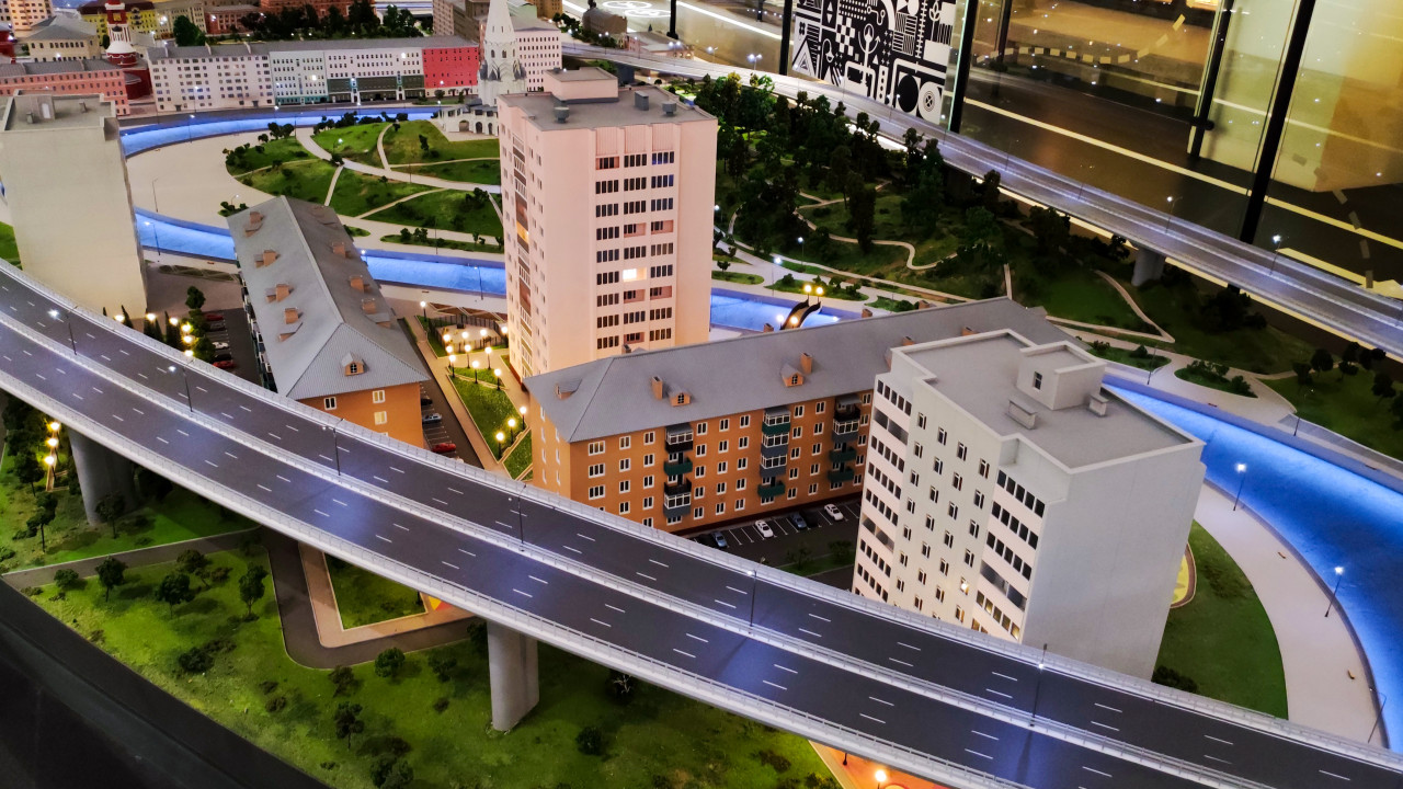 На фотографии запечатлён фрагмент 13-метрового макета Москвы, представленного в разделе «Город» Музея городского хозяйства Москвы в павильоне №5 ВДНХ. В кадре видны многоэтажные жилые дома типовой застройки, внутриквартальные проезды, озеленённые территории и протяжённая автомобильная эстакада, проходящая над жилым массивом. Подсветка элементов подчёркивает вечерний сценарий освещения города. Макет демонстрирует взаимосвязь транспортной инфраструктуры и жилых кварталов, а также принципы размещения дорог и инженерных коммуникаций. Снимок сделан в 2024 году во время выставки-форума «Россия». Фотография подходит для иллюстраций о градостроительстве, транспортном планировании, музейных и образовательных проектах.