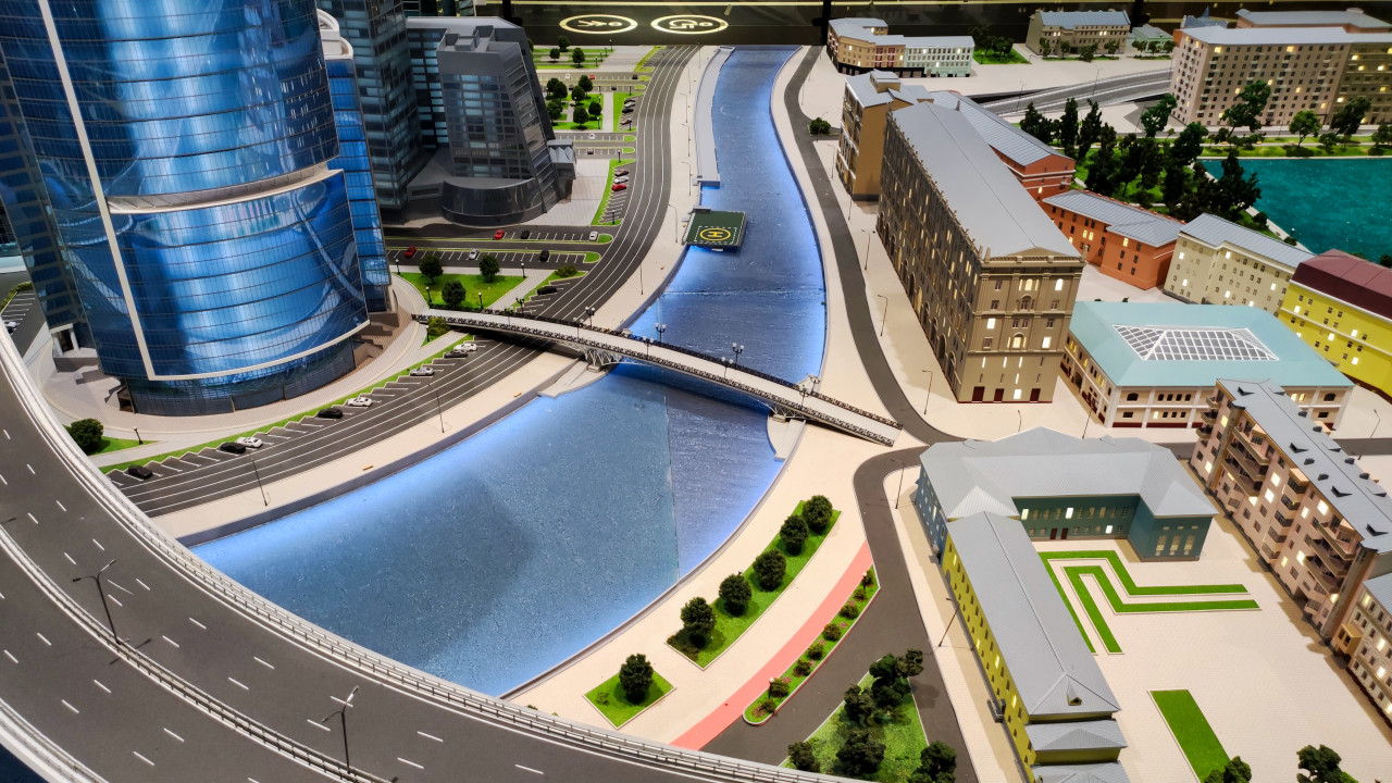 На изображении представлен фрагмент масштабного макета Москвы с водным каналом и мостом, экспонируемый в Музее городского хозяйства Москвы в павильоне №5 ВДНХ. В кадре виден изогнутый канал с подсветкой, пешеходный мост, проезжие части улиц и прилегающая застройка. Макет демонстрирует организацию водной инфраструктуры и транспортных связей в городской среде. Композиция позволяет наглядно проследить взаимодействие инженерных сооружений и городской застройки. Снимок сделан в 2024 году во время выставки-форума «Россия». Фотография может использоваться для иллюстраций о водном хозяйстве, транспорте и градостроительных проектах.