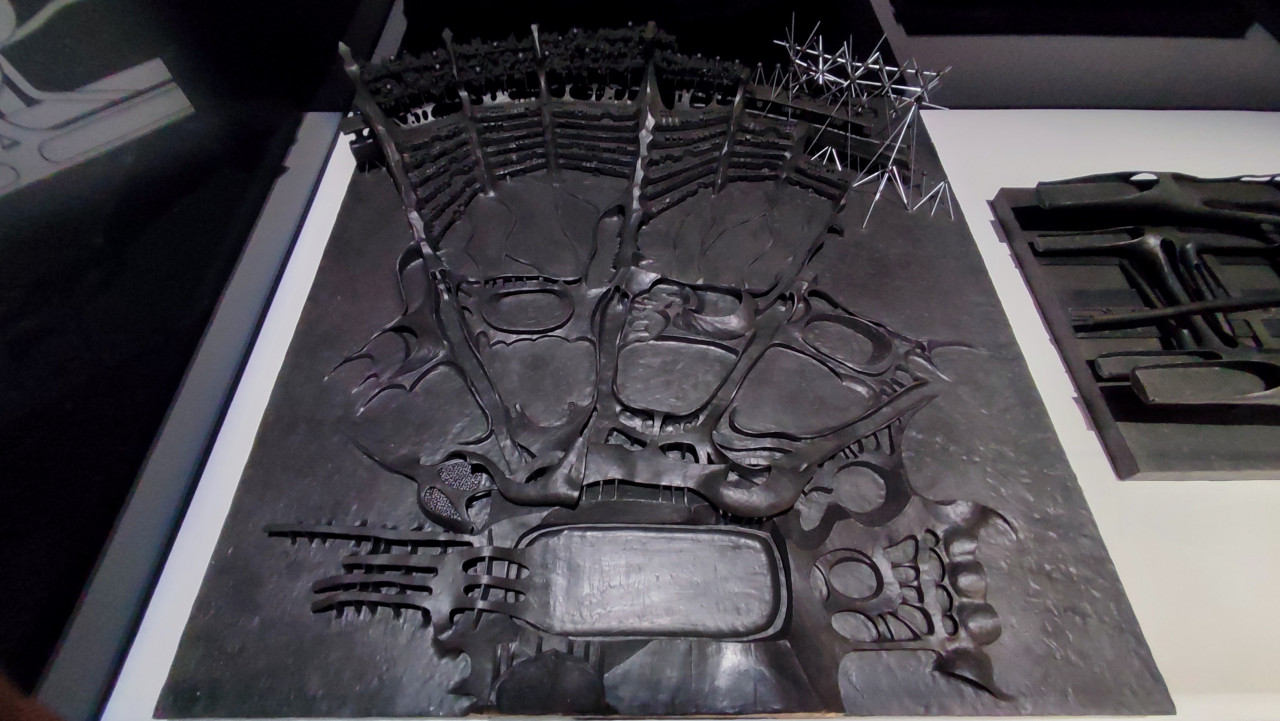 На снимке показан один из пластилиновых макетов проекта НЭР (Новый элемент расселения), созданного коллективом архитекторов МАРХИ под руководством А. Э. Гутнова и И. Г. Лежавы. В кадре различимы рельефные формы, отражающие деление системы на зону активной жизни и жилые кластеры, примыкающие к транспортному «руслу». Проект НЭР был революционным для своего времени и остался нереализованным, но получил международное признание после показа на Миланской триеннале 1968 года. Экспонат представлен на выставке Музея транспорта Москвы на ВДНХ.