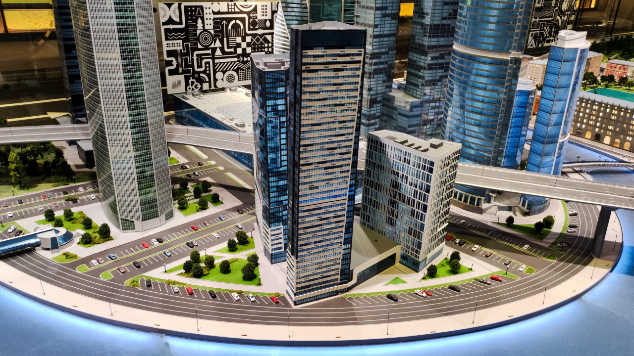 Фотография демонстрирует участок макета Москвы с современной деловой застройкой, представленный в Музее городского хозяйства Москвы на ВДНХ. В кадре расположены высотные офисные здания со стеклянными фасадами, многоуровневые транспортные развязки, улично-дорожная сеть и прилегающие зелёные зоны. Композиция отражает развитие деловых районов, плотную высотную застройку и интеграцию офисных комплексов в городскую инфраструктуру. На макете показаны автомобильные дороги с разметкой, парковочные зоны и элементы благоустройства. Снимок выполнен в 2024 году в рамках выставки-форума «Россия». Фотография может использоваться для материалов о современном градостроительстве, деловых центрах и инфраструктурных проектах.