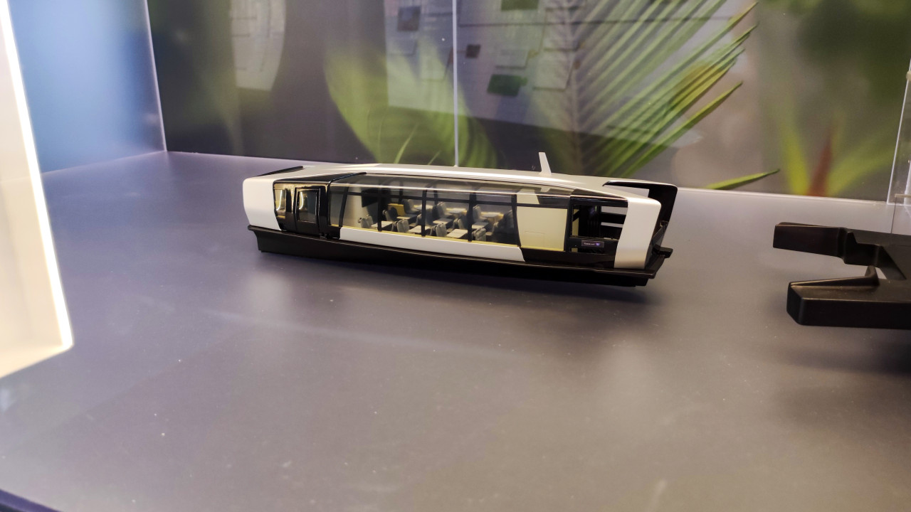 На фотографии представлен выставочный макет электрического речного трамвайчика, экспонируемый на выставке «Вы находитесь здесь. Всегда. Сегодня. Послезавтра» Музея транспорта Москвы в павильоне «Транспорт СССР» № 26 на ВДНХ. В кадре видна модель современного электрокатамарана с панорамным остеклением и детализированным интерьером пассажирского салона. Экспонат иллюстрирует развитие водного общественного транспорта Москвы и переход к экологичным видам передвижения. Электрические речные трамвайчики используются на регулярных маршрутах вдоль Москвы-реки и являются частью городской транспортной системы. Фотография может применяться в материалах о речном транспорте, городской инфраструктуре и транспортных инновациях.