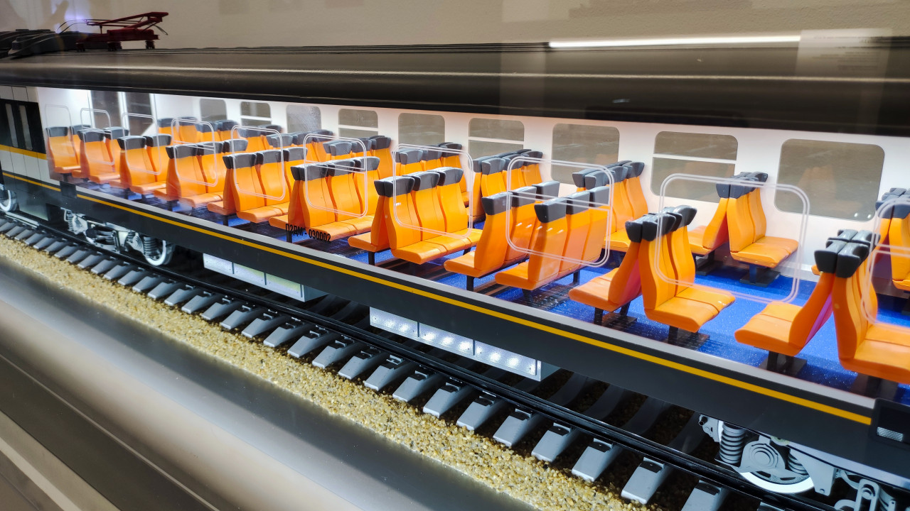 Фотография демонстрирует детализированный макет пассажирского железнодорожного вагона с разрезом, позволяющим рассмотреть интерьер. Внутри видны ряды оранжевых сидений, окна, элементы освещения и часть ходовой части с рельсами и балластом. Экспонат представлен на выставке Музея транспорта Москвы в павильоне «Транспорт СССР» на ВДНХ и используется для наглядного показа устройства и эволюции пассажирского транспорта. Макет иллюстрирует принципы организации салона и комфорт перевозок. Снимок подходит для материалов о железнодорожном транспорте, музейных экспозициях и транспортном дизайне.