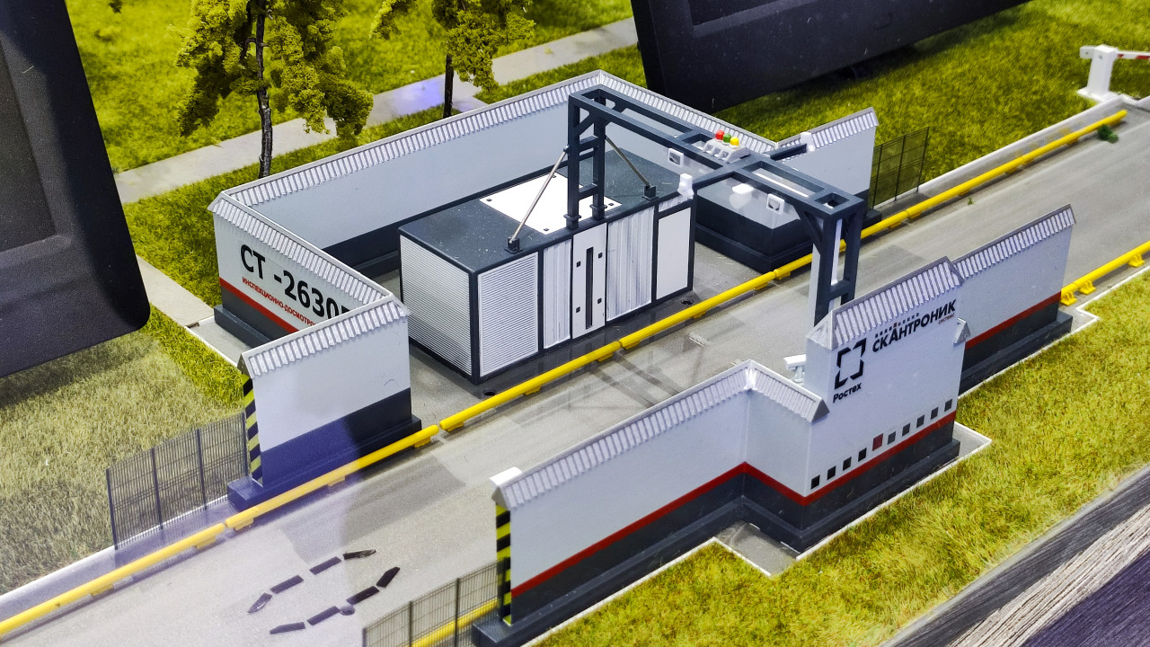 На фотографии показан фрагмент инфраструктурного макета транспортной системы России, представленного на экспозиции «Россия в движении» в павильоне №15 ВДНХ в рамках Международной выставки-форума «Россия». В центре кадра размещён масштабный макет стационарного пункта контроля и досмотра транспорта с проездной рамой, инженерными модулями и ограждениями. На элементах макета видны обозначения оборудования и логистической инфраструктуры, характерные для пунктов пропуска и транспортной безопасности. Съёмка выполнена в помещении выставки, используется для иллюстрации тем транспортной безопасности, логистики и цифрового контроля.