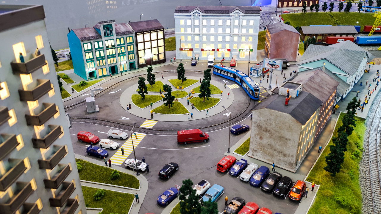 Парковка, трамвайные пути и административное здание на выставочном макете