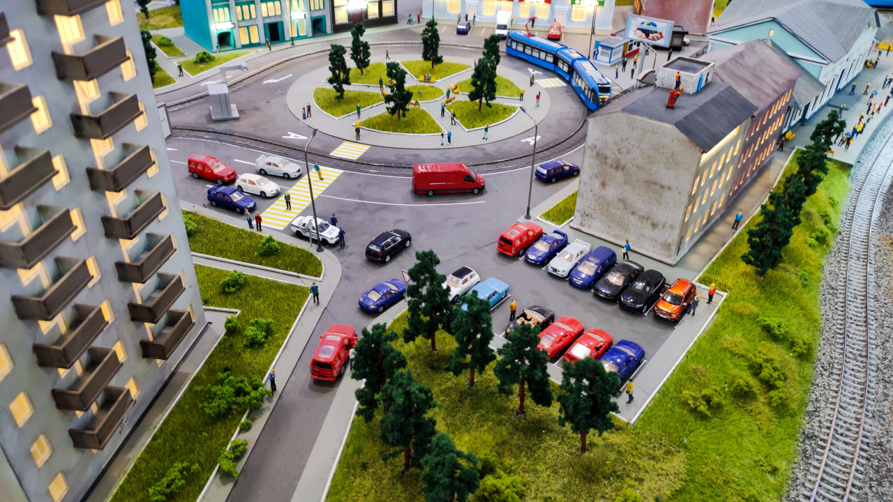 На фотографии запечатлён участок городского макета, представленного на выставке «Россия в движении» в павильоне №15 ВДНХ. В кадре видны жилая многоэтажка, придомовые проезды и парковка с рядом легковых автомобилей, тротуары и зелёные зоны с деревьями. По дороге проходит красный фургон, на дальнем плане заметны трамвайные пути и круговое движение. Справа вдоль макета тянется линия железной дороги. Снимок можно использовать в публикациях о городской среде, планировании дворов и транспортной доступности.