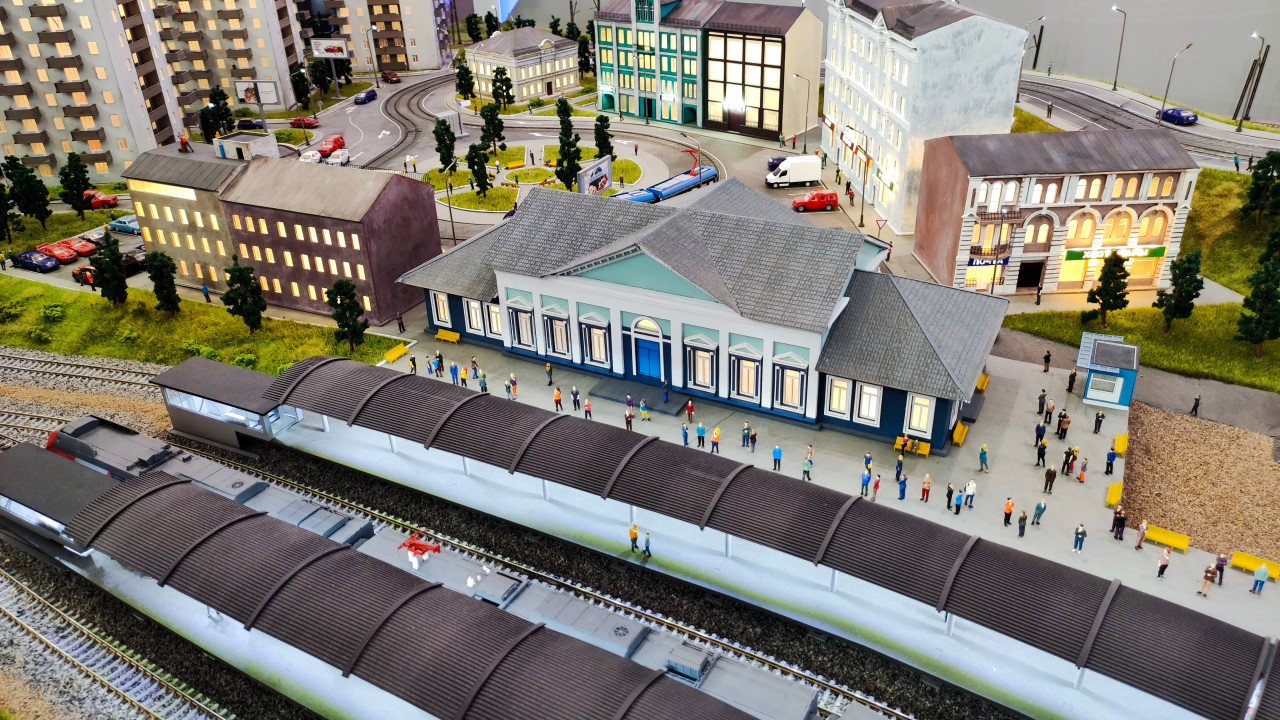 На фотографии представлен пассажирский узел на инфраструктурном макете транспортной системы России, экспонируемом на выставке «Россия в движении» в павильоне №15 ВДНХ. В кадре видны здание станции с входной группой, длинная платформа с навесом и железнодорожные пути. На платформе размещены миниатюрные пассажиры, рядом стоят лавочки и фонари. На заднем плане показана городская застройка, трамвайная линия и грузовая зона с контейнерами. Фото подходит для материалов о железнодорожных перевозках, планировании вокзальных территорий и транспортной доступности.