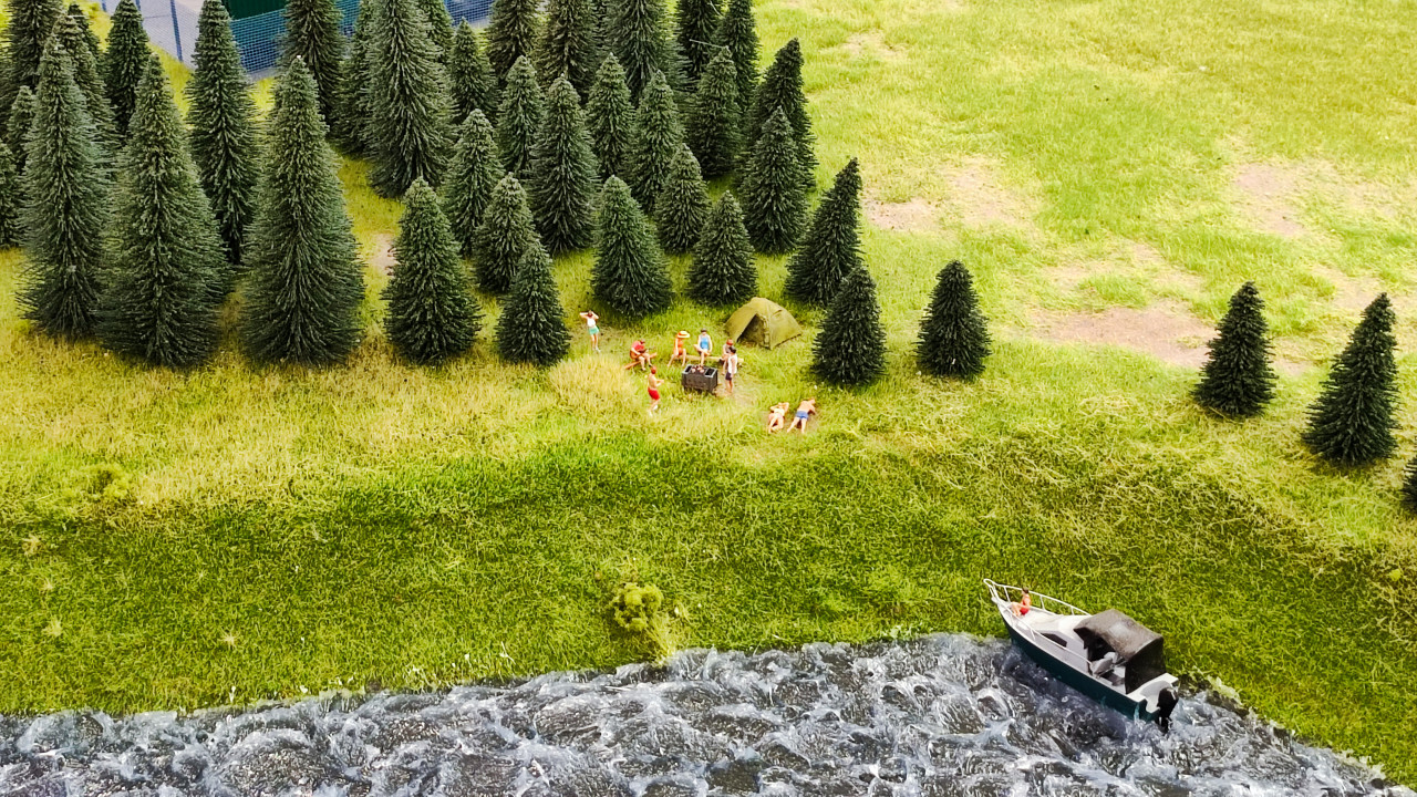 На фотографии показан фрагмент инфраструктурного макета транспортной системы России из экспозиции «Россия в движении» в павильоне №15 ВДНХ. В кадре изображена береговая линия реки с выраженным течением, травянистый склон и хвойный лес. На поляне размещена группа отдыхающих, палатка и походное снаряжение, у воды пришвартована моторная лодка. Сцена иллюстрирует рекреационное использование природных территорий вблизи внутренних водных путей и может применяться в материалах о туризме, экологии и водном транспорте.