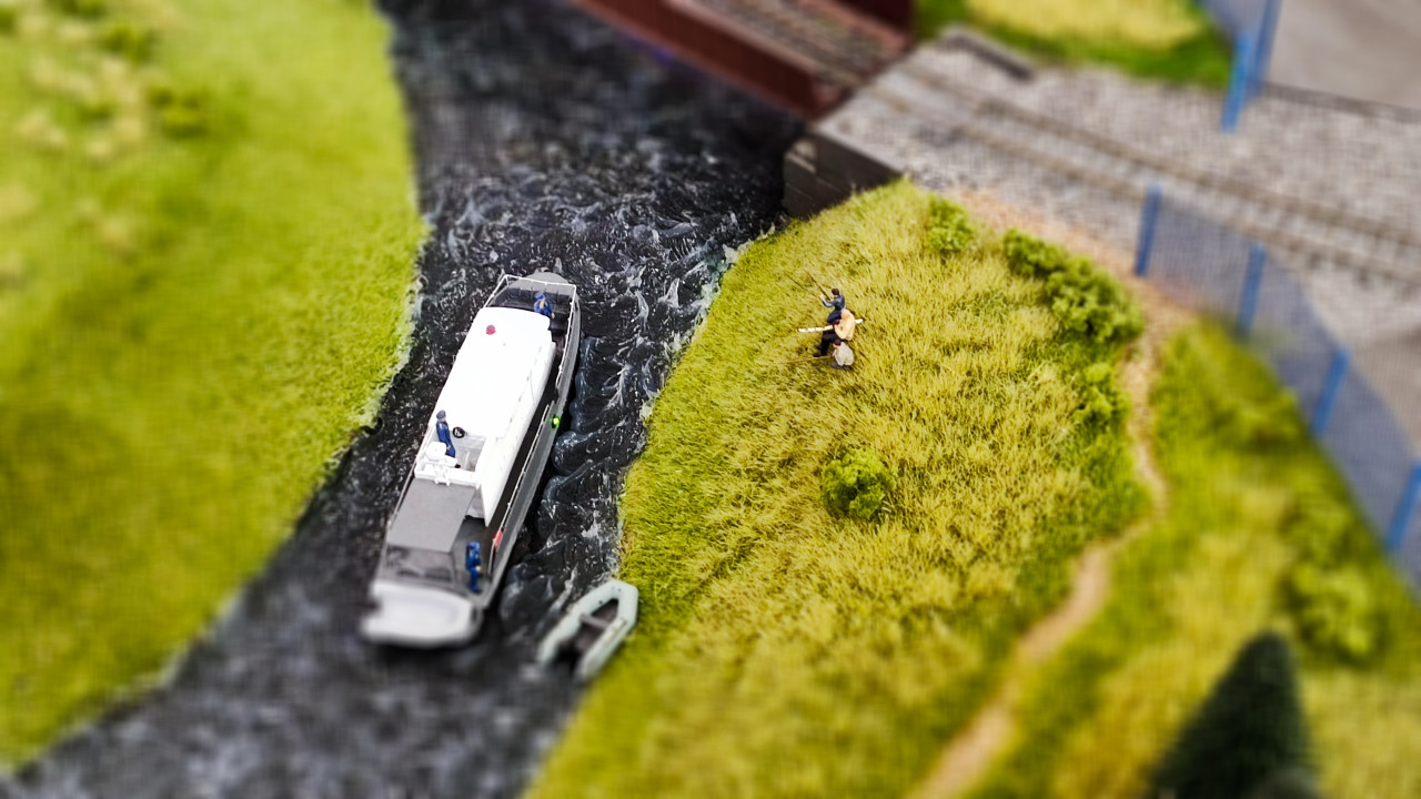На фотографии представлен участок инфраструктурного макета транспортной системы России, демонстрируемый в павильоне №15 ВДНХ на выставке «Россия в движении». В кадре показано судно, движущееся по реке, береговая линия с травянистым покрытием и фигурки людей у воды. Рядом видны элементы промышленной инфраструктуры и ограждения. Макет отражает использование внутренних водных путей для транспортировки и взаимодействие водного транспорта с прибрежными территориями.