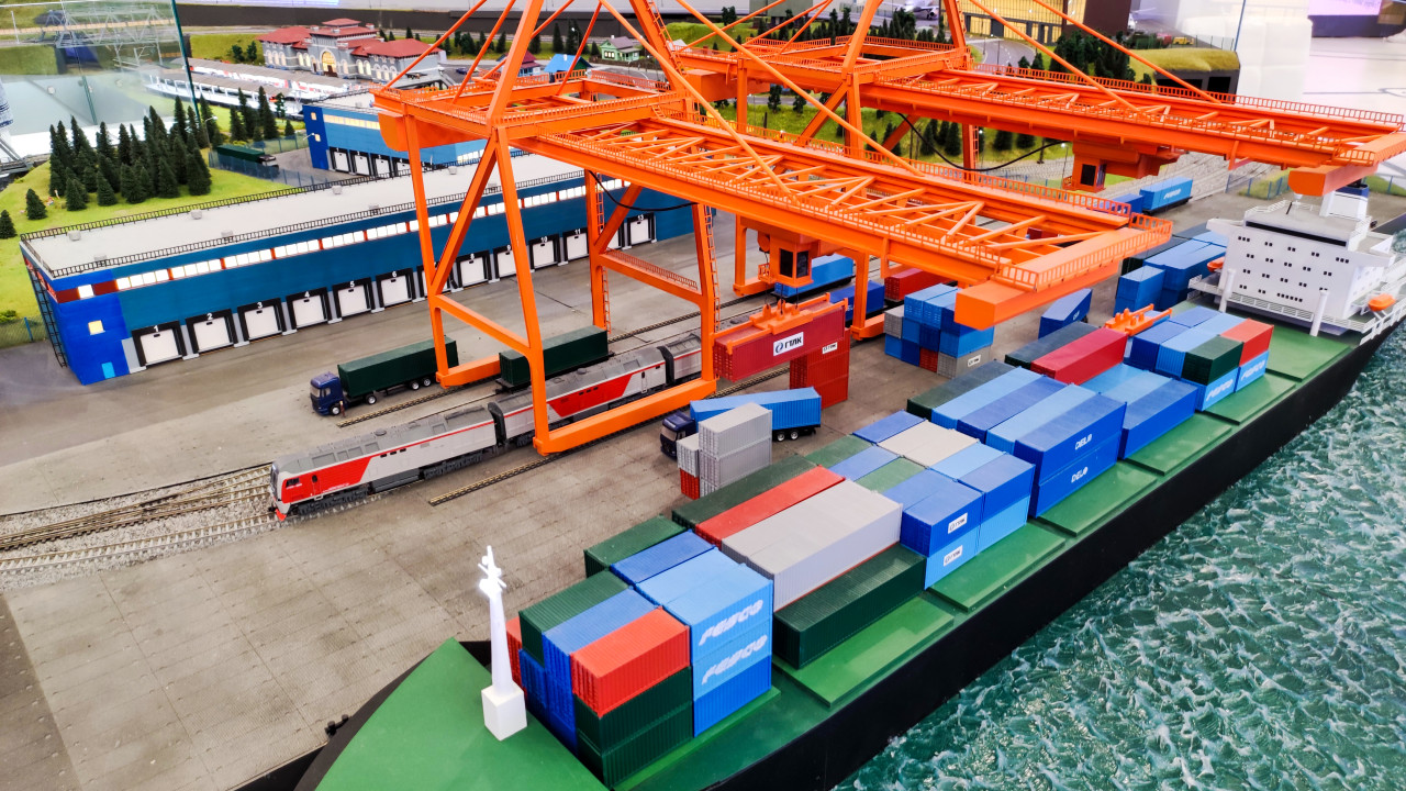 вднх москва выставка россия экспозиция музей выставочный павильон выставочный объект демонстрационный макет модель инженерия транспорт транспортная инфраструктура макет инфраструктурный макет масштабная модель контейнерный терминал порт портовая инфраструктура грузовой транспорт контейнеры логистика мультимодальные перевозки железнодорожный транспорт грузовой поезд морской транспорт перевалка грузов ВДНХ павильон 15 Россия в движении выставка транспорт России контейнерные перевозки грузовой терминал портовый комплекс логистическая инфраструктура международная логистика транспортный хабПохожие фотографии
