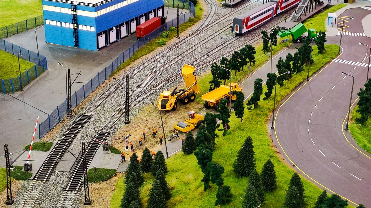 Железнодорожный переезд и строительная техника на инфраструктурном макете