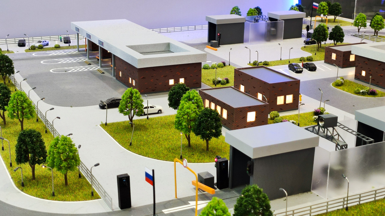 Фотография показывает макет зоны инспекционно-досмотрового контроля, представленный в рамках экспозиции «Россия в движении» в павильоне №15 на ВДНХ. В композиции различимы въездные и выездные полосы, портальные сканирующие модули, служебные постройки, автомобили, ограждения, инженерные конструкции и элементы благоустройства. Макет демонстрирует принципы работы современных систем, обеспечивающих непрерывное и безопасное сканирование транспортных средств и грузов. Выставка открылась в ноябре 2023 года и была посвящена перспективным транспортным и логистическим решениям страны. Изображение может использоваться в публикациях о развитии инфраструктуры, транспортной безопасности и отраслевых выставках.