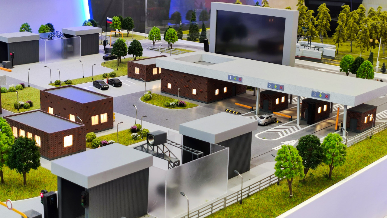 На фотографии представлен детализированный макет портального инспекционно-досмотрового комплекса, экспонировавшийся на выставке «Россия в движении» в павильоне №15 ВДНХ. В кадре видны портальные рамки досмотра, въездные полосы с разметкой, шлагбаумы, служебные здания, системы видеонаблюдения, уличное освещение и элементы озеленения. Макет иллюстрирует работу современных решений для автоматизированного контроля транспортных средств и грузов без остановки потока. Экспозиция была открыта в ноябре 2023 года и демонстрировала достижения транспортной и логистической отрасли России. Фотография подходит для материалов о транспортной безопасности, инфраструктурных проектах и выставочной деятельности.