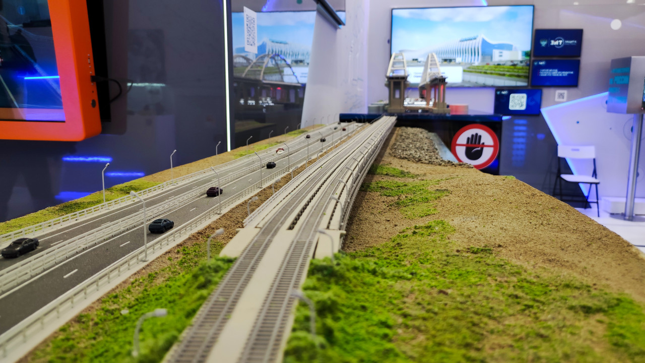 На фотографии запечатлён масштабный макет транспортной инфраструктуры, обеспечивающей подъезд к Крымскому мосту, размещённый в экспозиции «Россия в движении» в павильоне №15 ВДНХ. В кадре представлены автомобильная магистраль, железнодорожная линия, опоры, элементы дорожного полотна, моделированный рельеф и озеленение, а также выставочное мультимедийное оборудование на заднем плане. Макет демонстрирует комплексный подход к проектированию подъездных путей и транспортных коридоров. Экспозиция была открыта в ноябре 2023 года в рамках форума «Россия». Фотография подходит для использования в материалах о транспорте, инфраструктуре и выставочной деятельности.