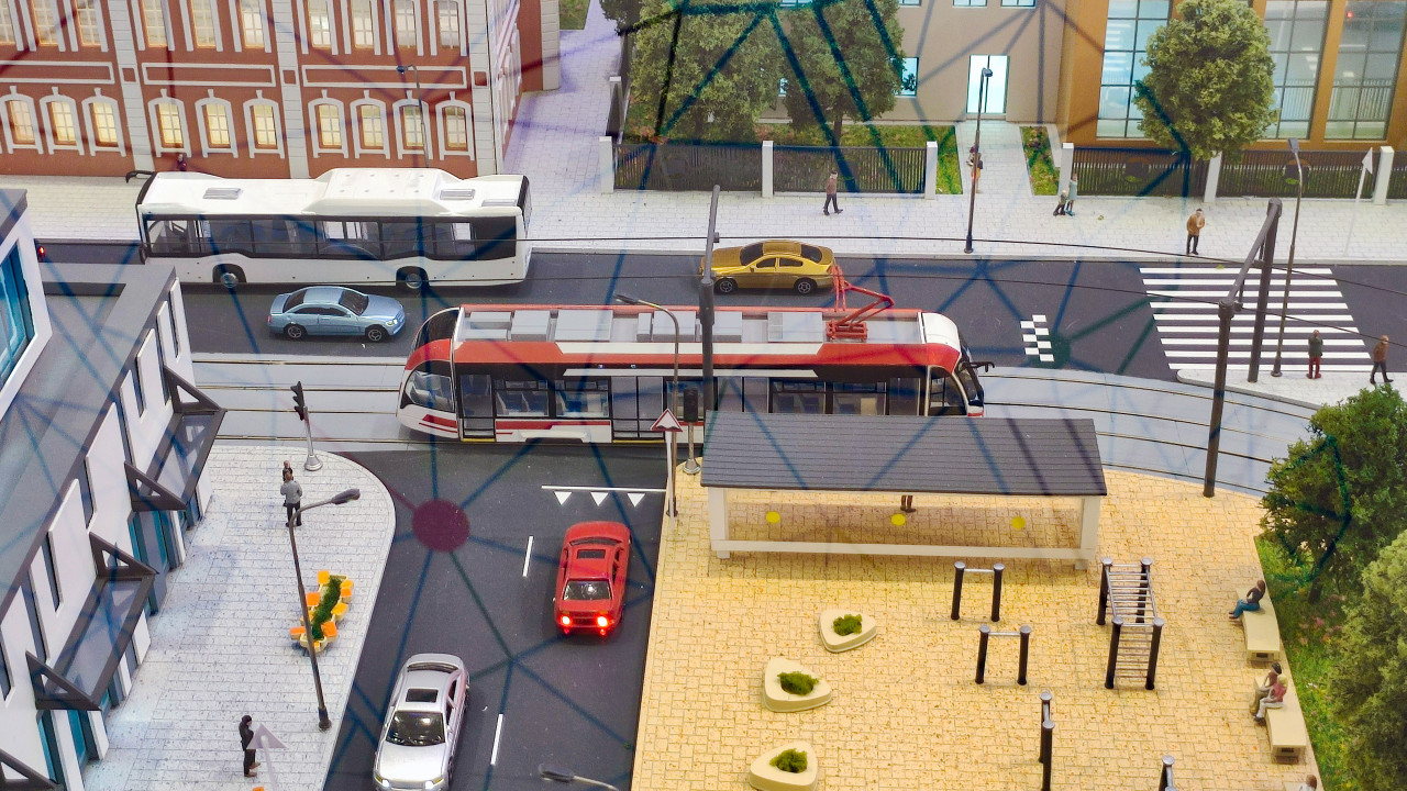 На фотографии представлен детализированный макет городского перекрёстка с трамвайным движением, экспонируемый на выставке «Россия в движении» в павильоне №15 ВДНХ. В кадре видны трамвайный состав, автомобильное движение, пешеходные переходы, остановочные павильоны, элементы благоустройства и застройки. Макет отражает взаимодействие различных видов транспорта в городской среде и вопросы организации движения. Экспозиция была открыта в ноябре 2023 года в рамках Международной выставки-форума «Россия». Фотография подходит для использования в материалах о транспорте и урбанистике.