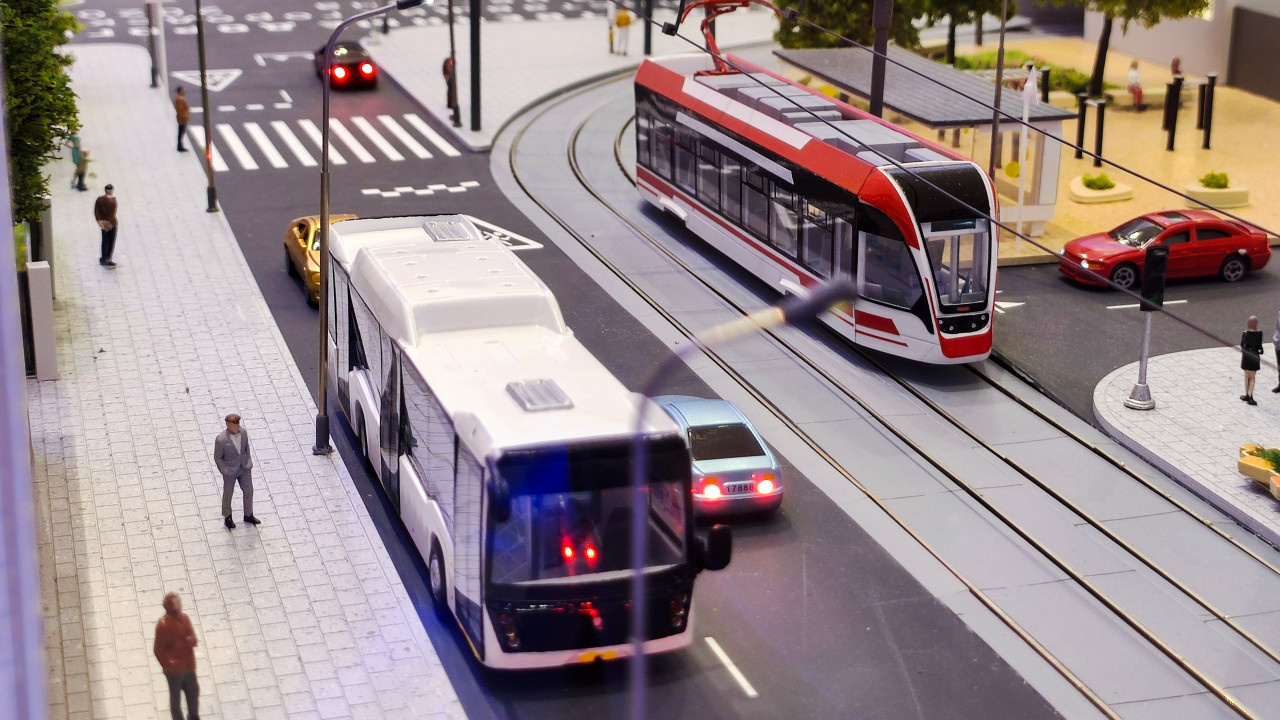 Фотография показывает участок масштабного макета с современным трамваем, движущимся по выделенной линии на городском перекрёстке. Экспонат является частью экспозиции «Россия в движении» в павильоне №15 ВДНХ. В кадре присутствуют трамвайные пути, автомобильный транспорт, пешеходы, остановка, светофор и элементы благоустройства. Макет наглядно демонстрирует взаимодействие различных видов транспорта в городской среде и используется для иллюстрации транспортного моделирования и инфраструктурных решений.
