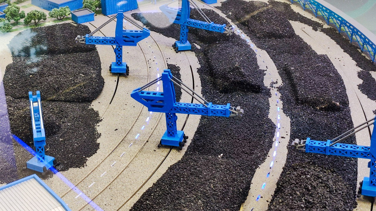 На снимке запечатлён фрагмент масштабного макета промышленно-транспортной зоны с портальными кранами и путями перемещения грузов, экспонируемый в рамках выставки «Россия в движении» в павильоне №15 ВДНХ. В кадре различимы зоны хранения сыпучих материалов, рельсовая инфраструктура, краны и вспомогательные сооружения. Макет наглядно демонстрирует организацию грузовых потоков и технологические процессы в логистических и промышленных кластерах. Фотография подходит для иллюстрации тем, связанных с логистикой и развитием инфраструктуры.